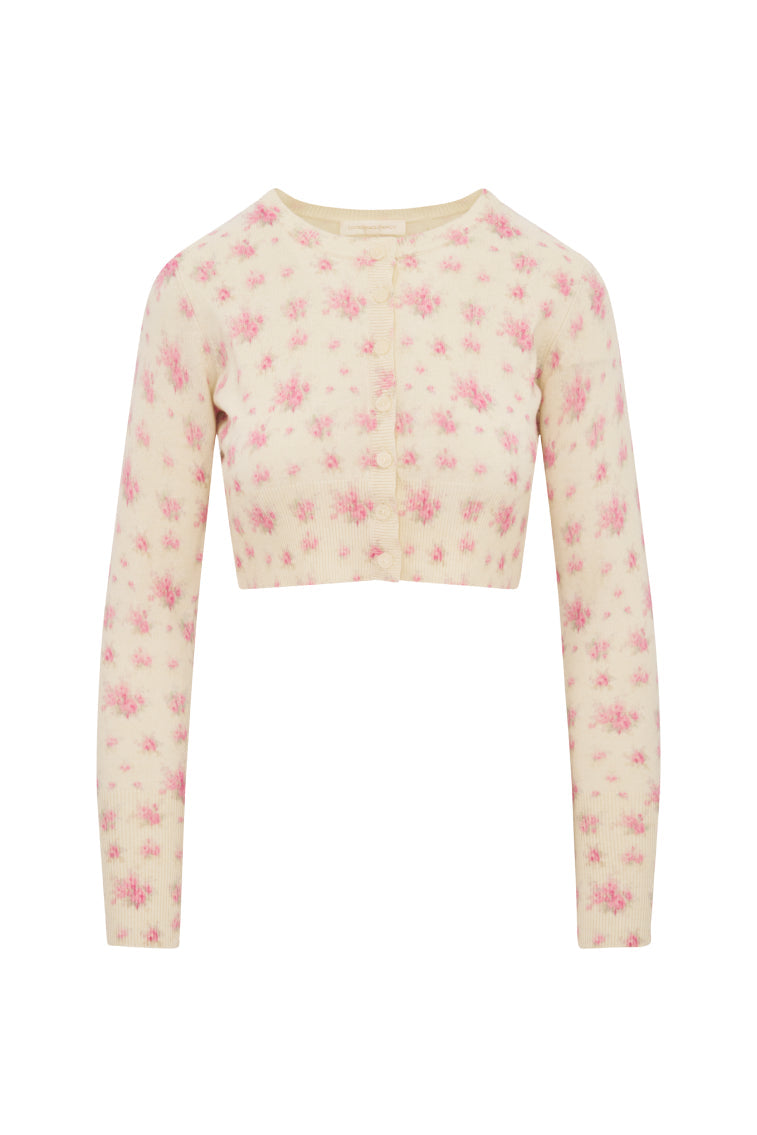 Living in the Adeanne Cardigan. This cute knit is designed from wool, giving it an extra warm and cozy feel. The sweater features our Pasadena Rose print all over for a playful touch. Self-covered buttons line center front.