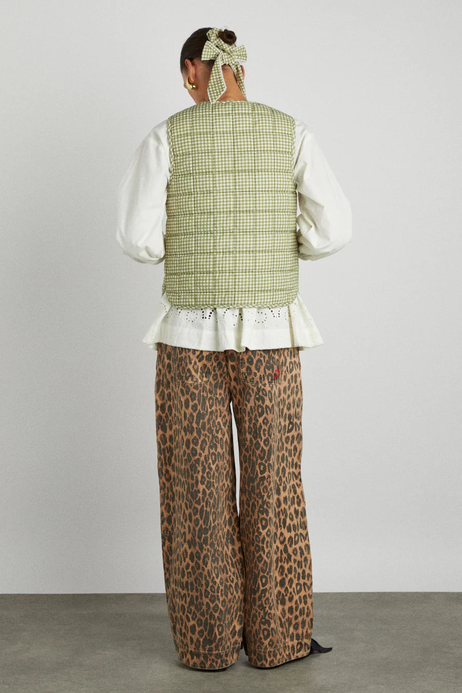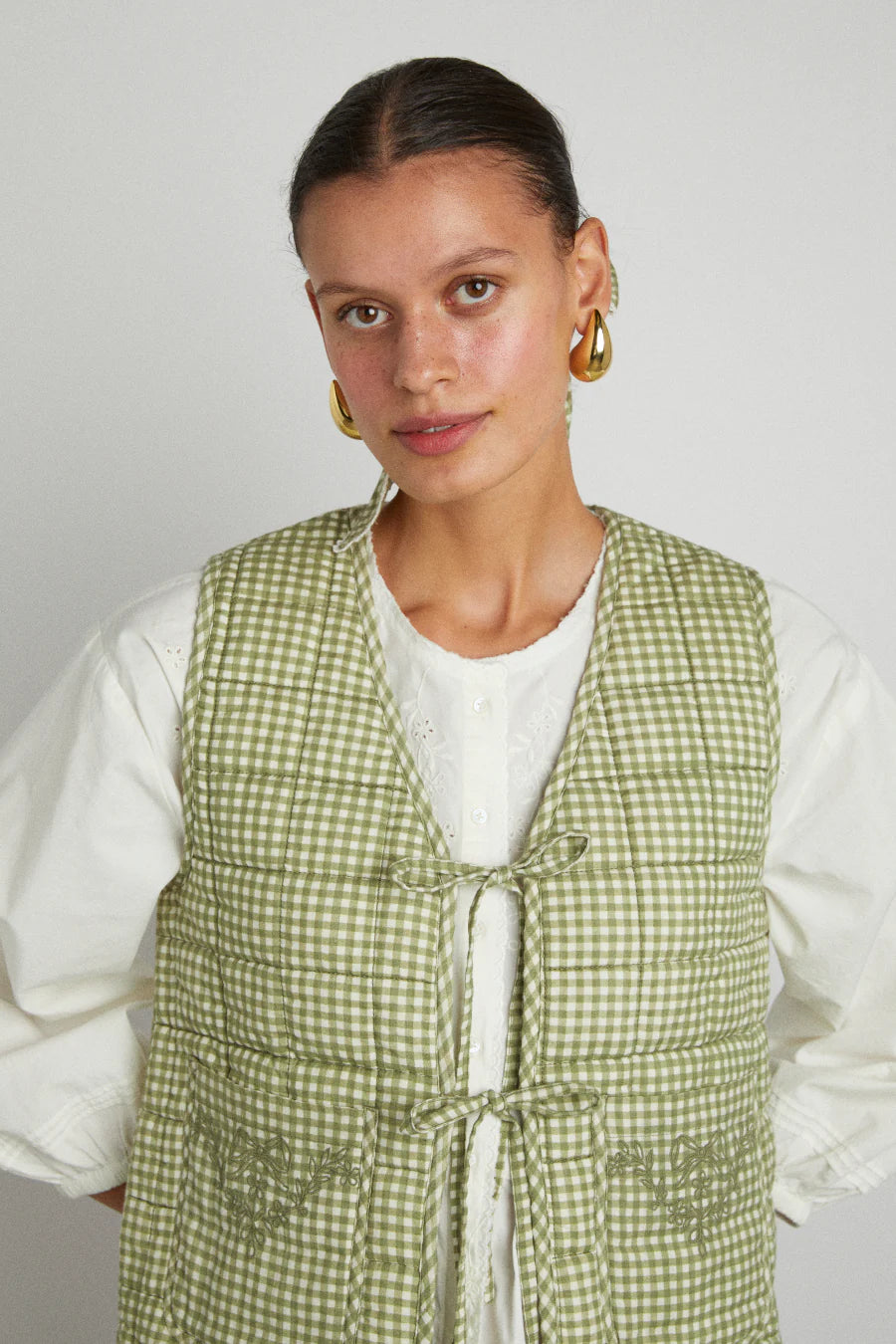 The Arte Gilet is our all over green check cropped gilet featuring a tie front closure. front pockets and bow embroidery detail.