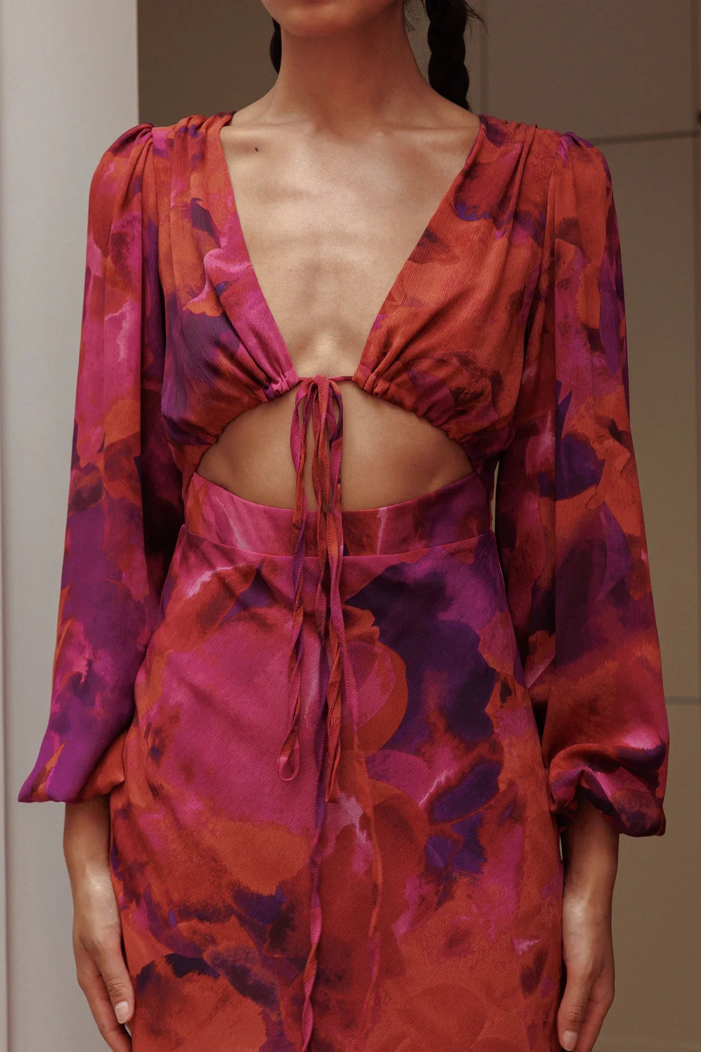 Float through your weekend in our stunning Aurora Dreams midi dress. It features a cut-out waist and tied bust and is perfect for weekend brunch dates with your girls. Team it with mules and a tote for a chic look that will turn heads.