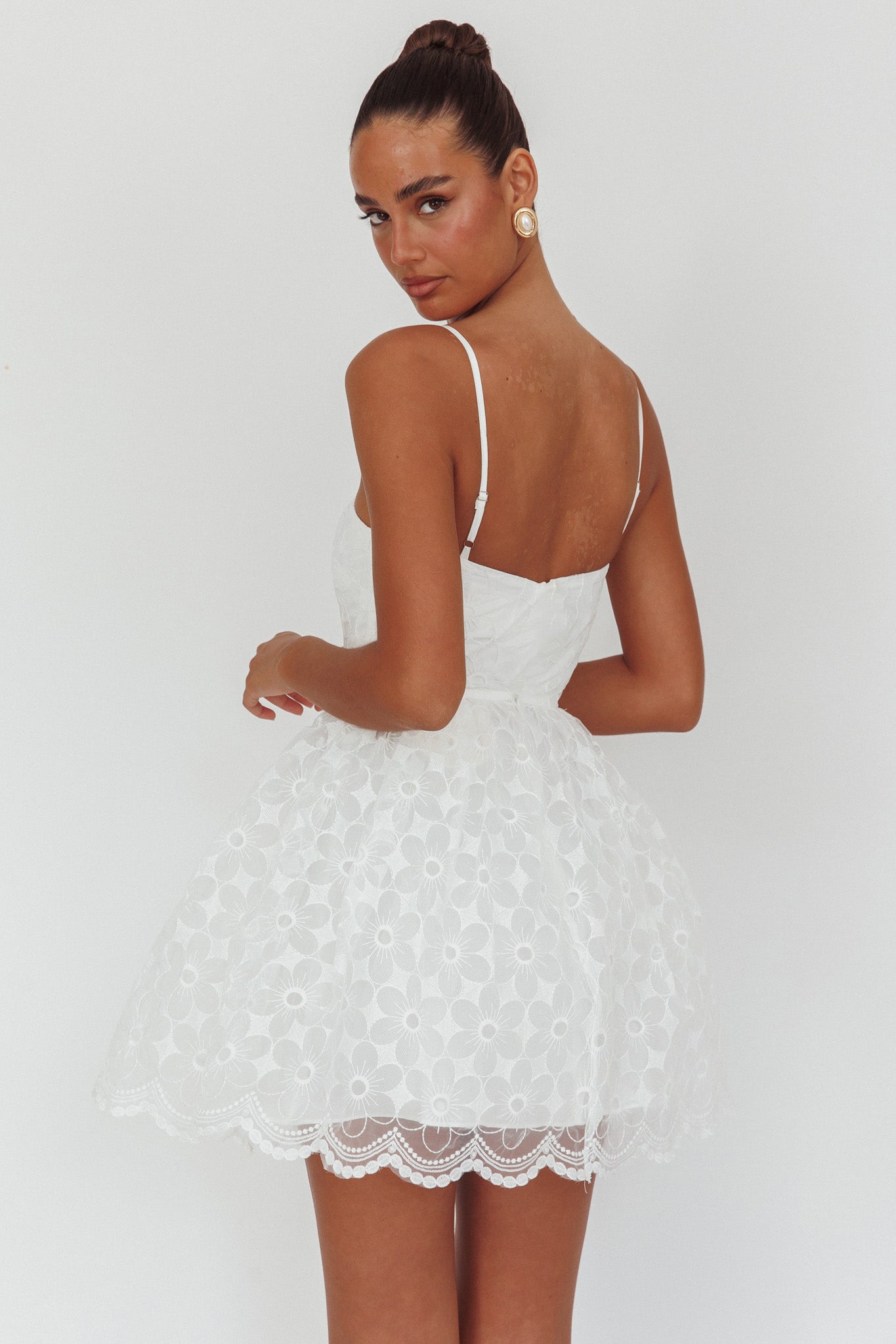 Turn heads in our gorgeous Bahia mini dress. It features a stunning lace overlay and mesh in the skirt for added volume, making it perfect for twirling the night away! Team it with white heels and a clutch for an unforgettable look.