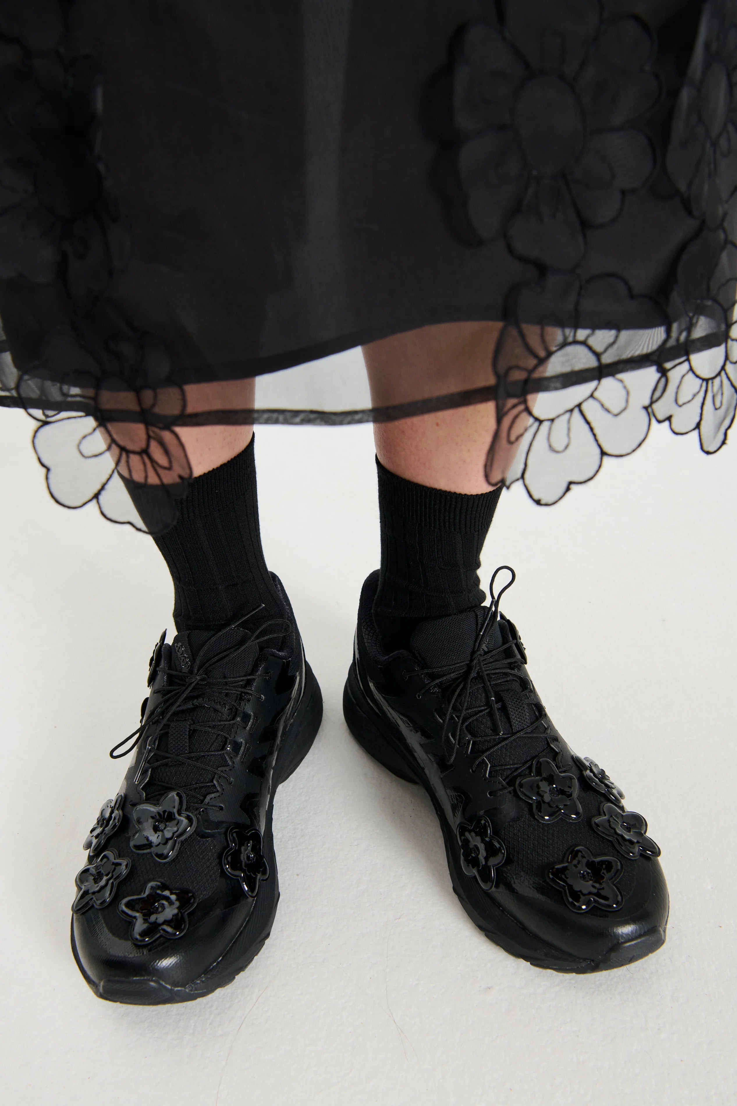 Working with the Gel-Terrain model. the trainer lays on the GT 2000 8 base. providing stability and support while maintaining a lightweight feel. The construction features a ripstop mesh upper. with padded 3D flowers scattered across the shoeís surface.†A glossy finish contrasts the delicacy of signature florals. while a monochromatic colour palette creates a sleek. elevated feeling. The lacing system uses a technical speed lacing construction. made ultra-feminine through a bespoke. floral puller piece. Debuted on Bahnsenís Fall Winter 2024 runway show at Paris Fashion Week. the latest launch offers her signature feminine interpretation of ASICSí Gel-Terrain sneakers. presented in three colourways.