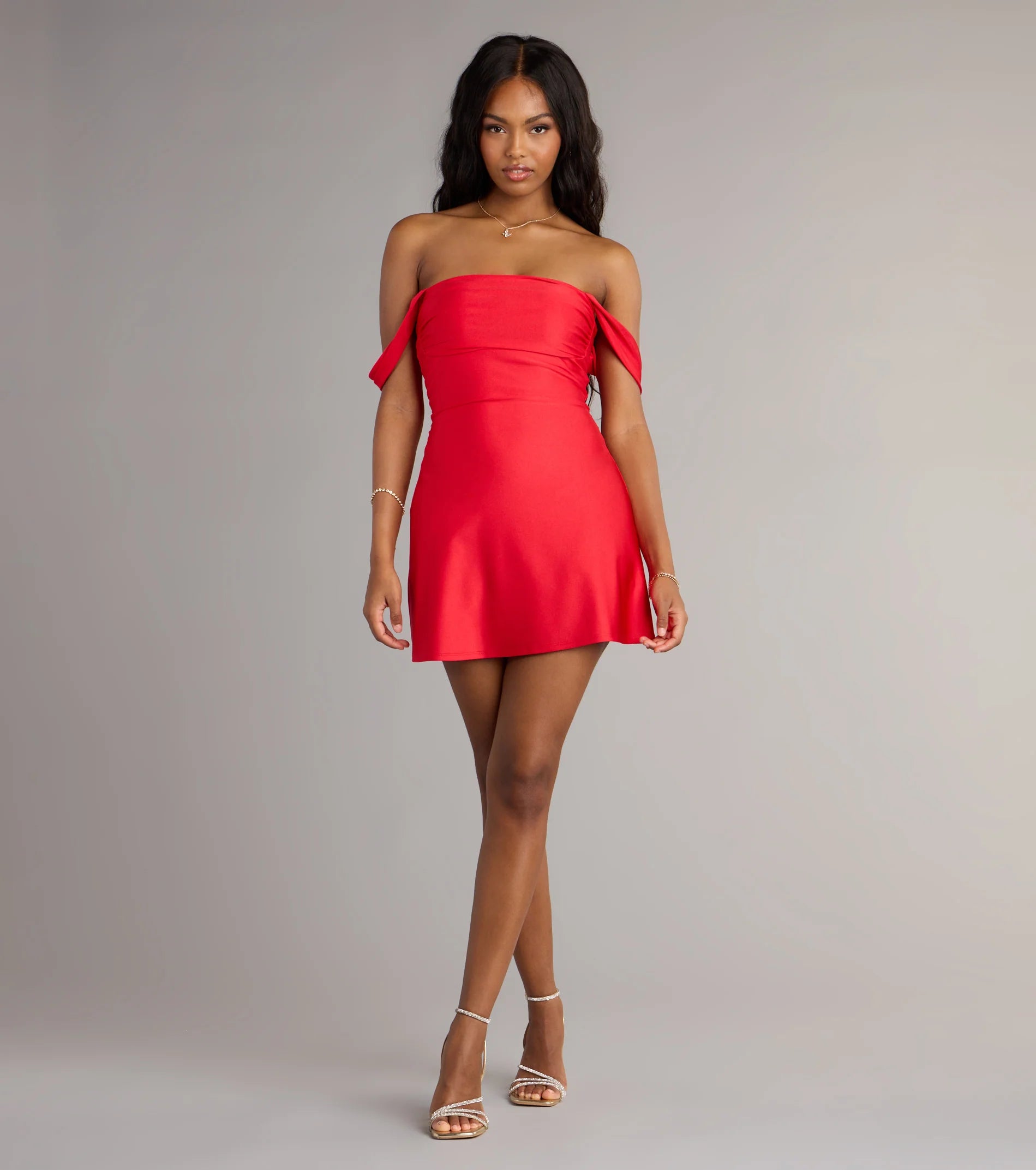 This satin mini dress will be your favorite for celebrations, events, and date nights! Sleek and smooth satin shapes this off-the-shoulder dress, which features a flattering A-line silhouette perfect for styling with heels.