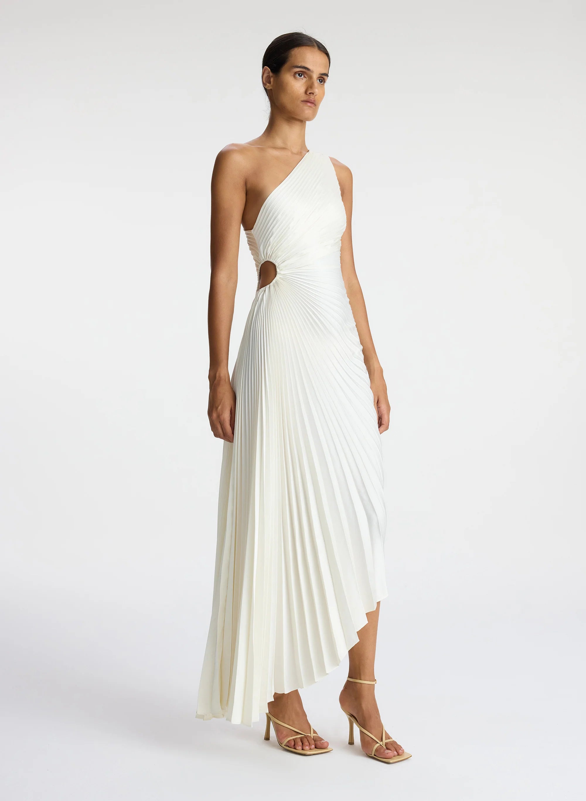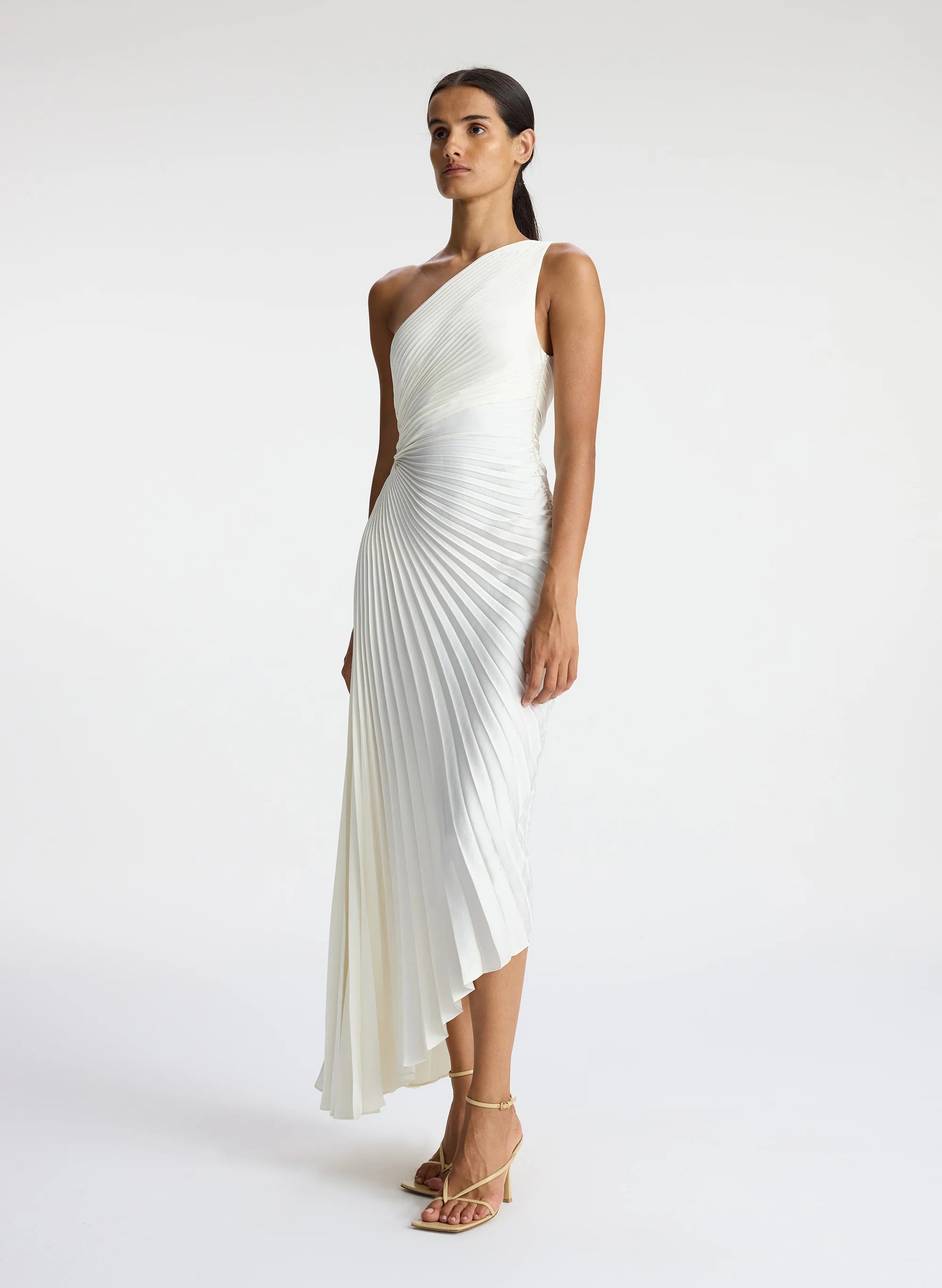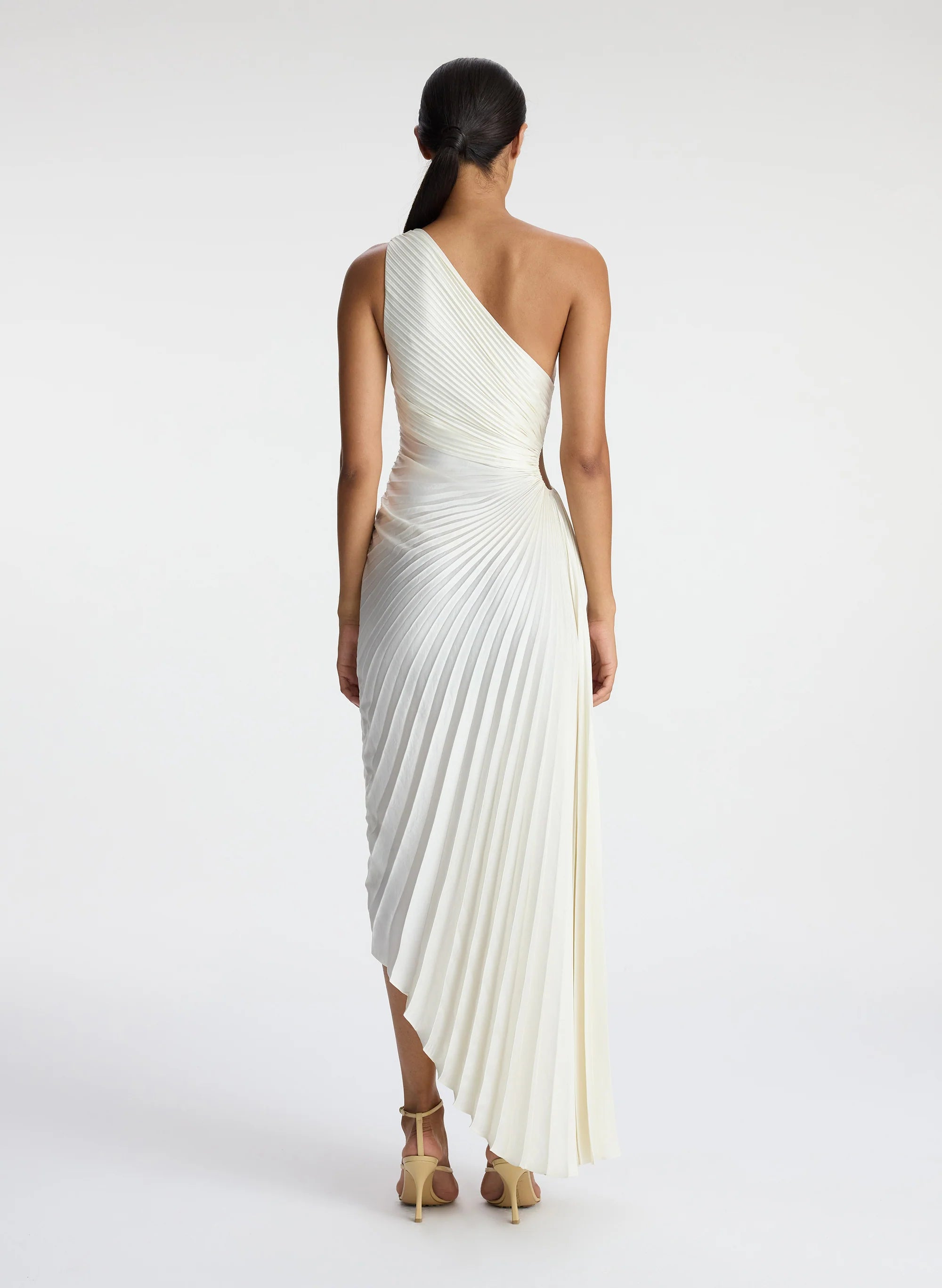 The Delfina Dress is asymmetrically draped and pleated from our vintage satin fabric in a lustrous winter white shade. This one-shoulder silhouette features a confident side cutout and high-low hem. This style runs true to size. Shop Dresses