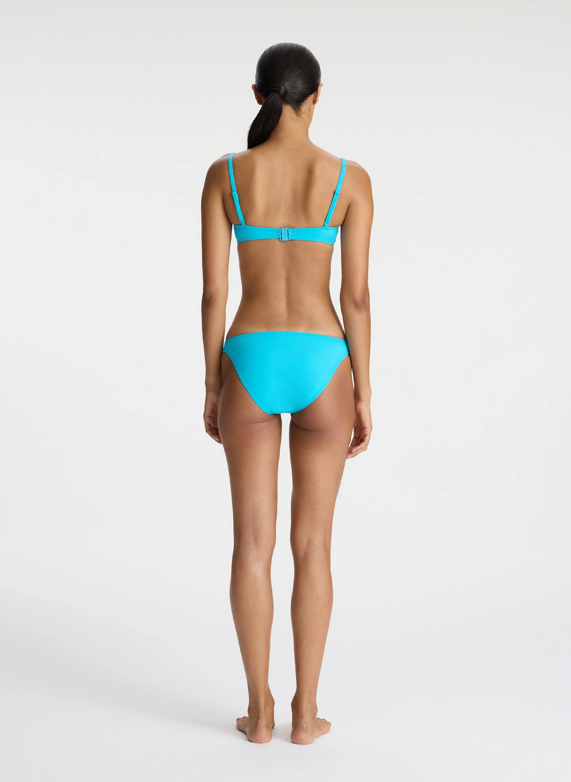 The Dylan Bikini Top is crafted of sculpting stretch fabric in an aqua-blue hue. It features underwire cups. thin adjustable straps. and a clasp closure. This style runs true to size. Shop Swimwear