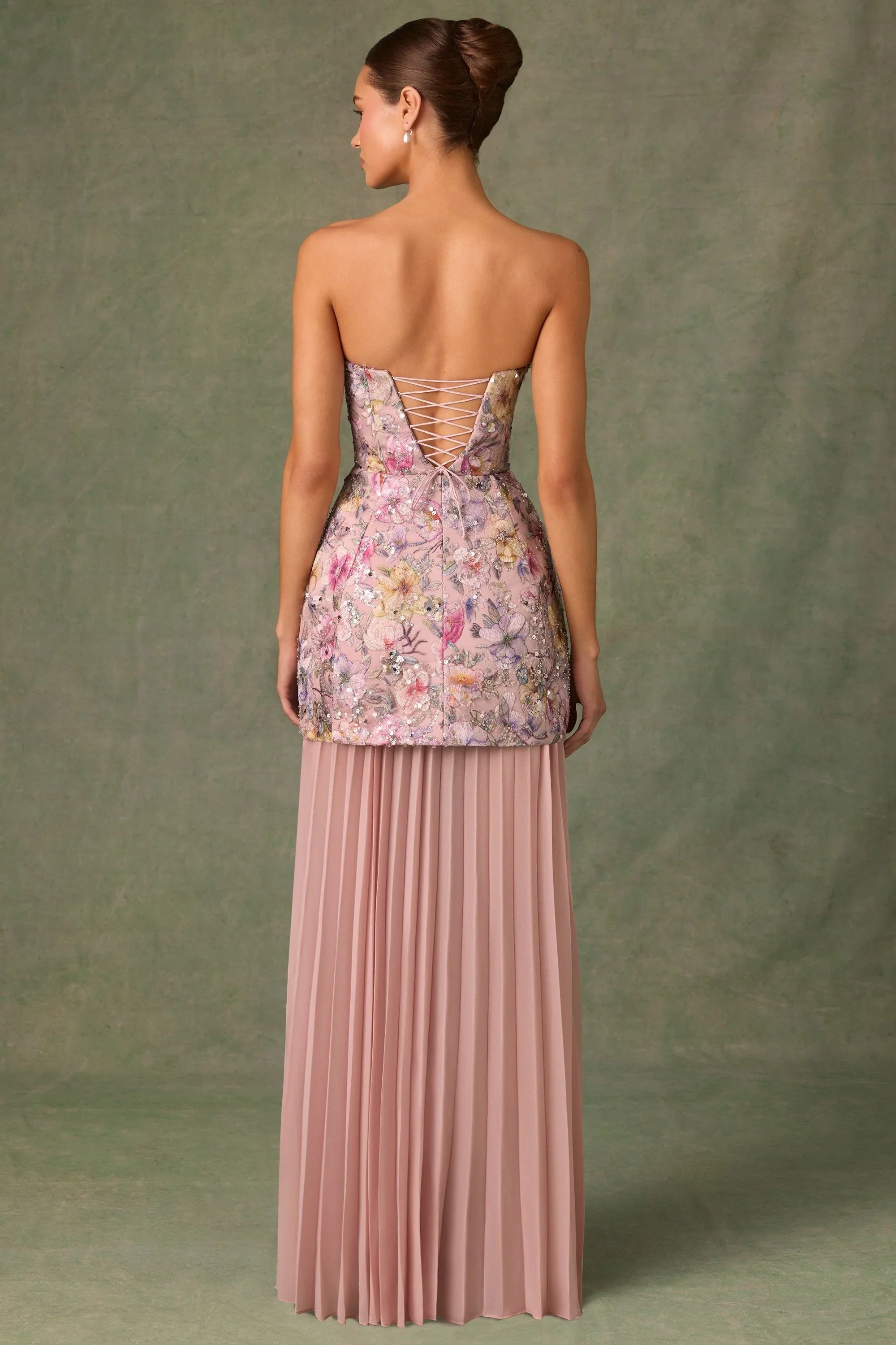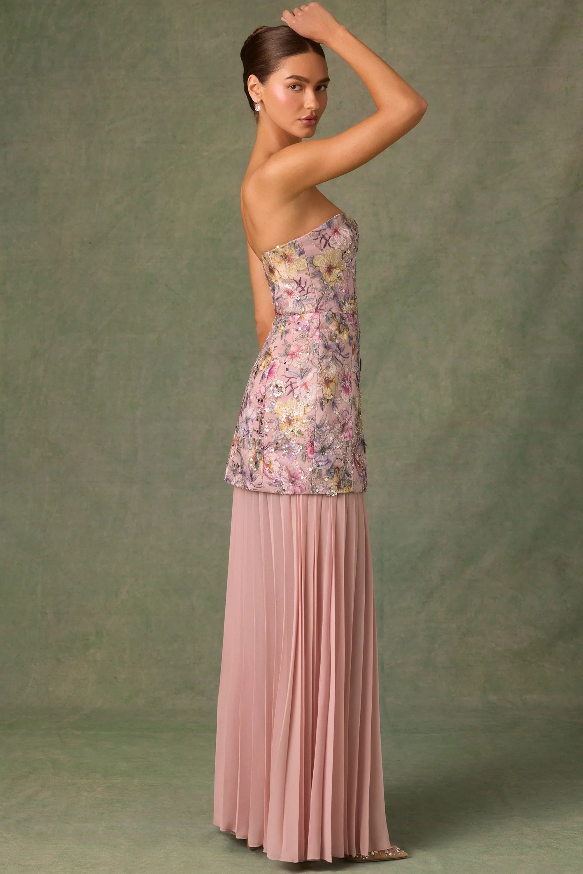 Pushing the boundaries of design, Galia is our newest convertible style that transforms from a full-length gown to a structured mini for two head-turning looks in one. It features an A-line overlay crafted from premium mesh fabric, lined with satin, and topped with custom floral appliqués, brought to life with perfectly placed sequin embellishments. It’s complete with a detachable pleated chiffon skirt for customisable styling.