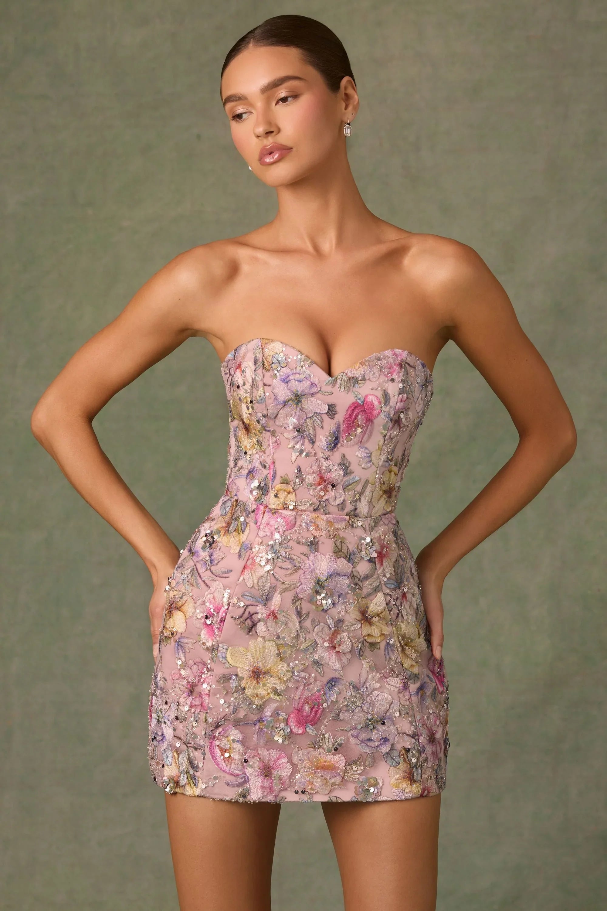 All-over custom floral appliqués and sequin embellishment