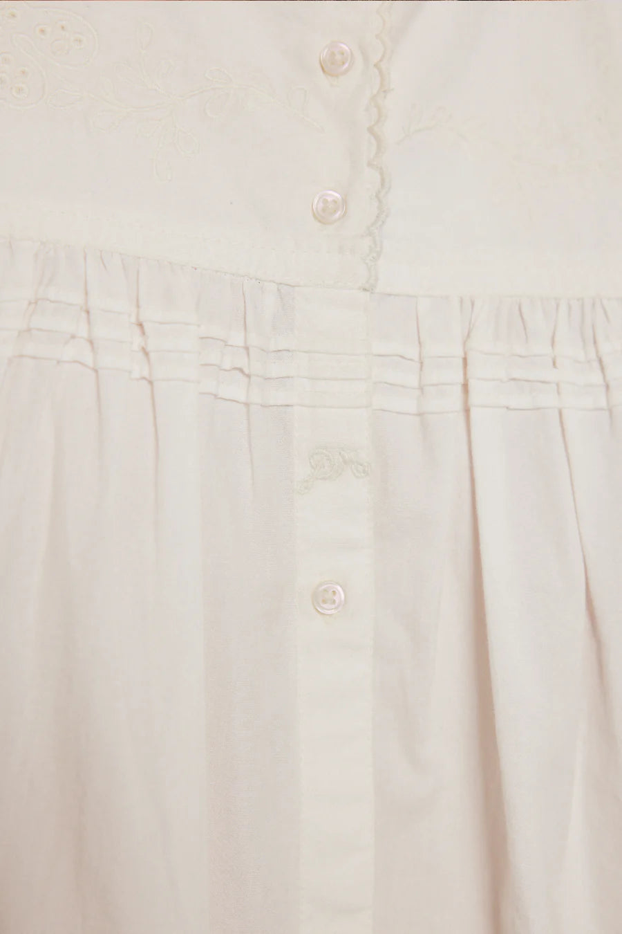 Our Genevieve mini dress boasts organic cotton poplin. intricate broderie detailing on the chest and sleeve and a collarless buttoned front fastening.