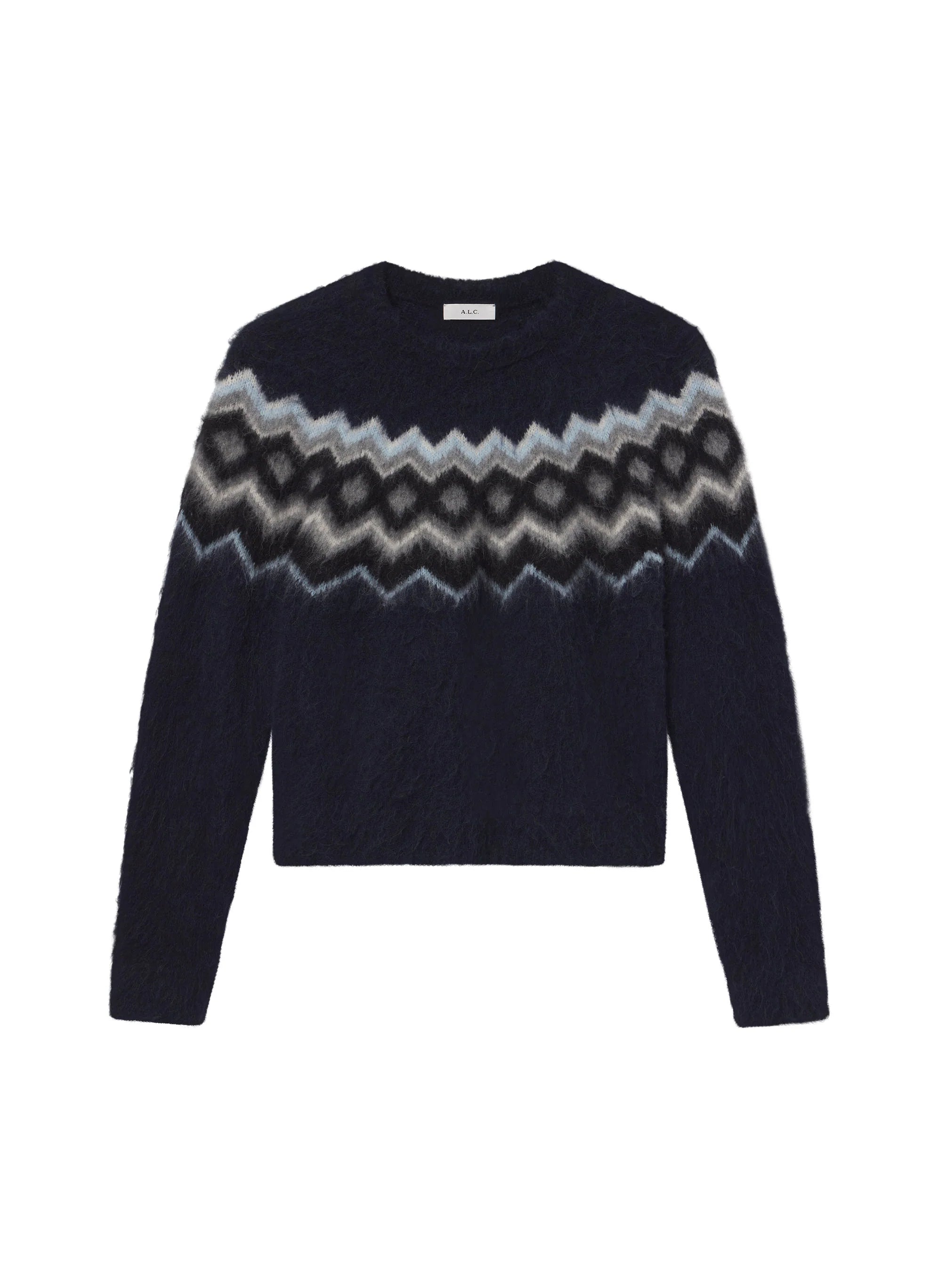The Ezra Sweater is crafted from luxurious brushed alpaca in deep navy with a traditional Fair Isle pattern. showcasing artisanal craftsmanship. This relaxed silhouette features a high. rounded neckline with intricate ribbed detailing at the neck. hem. and cuffs. adding subtle texture to the cozy knit. Shop Sweaters.