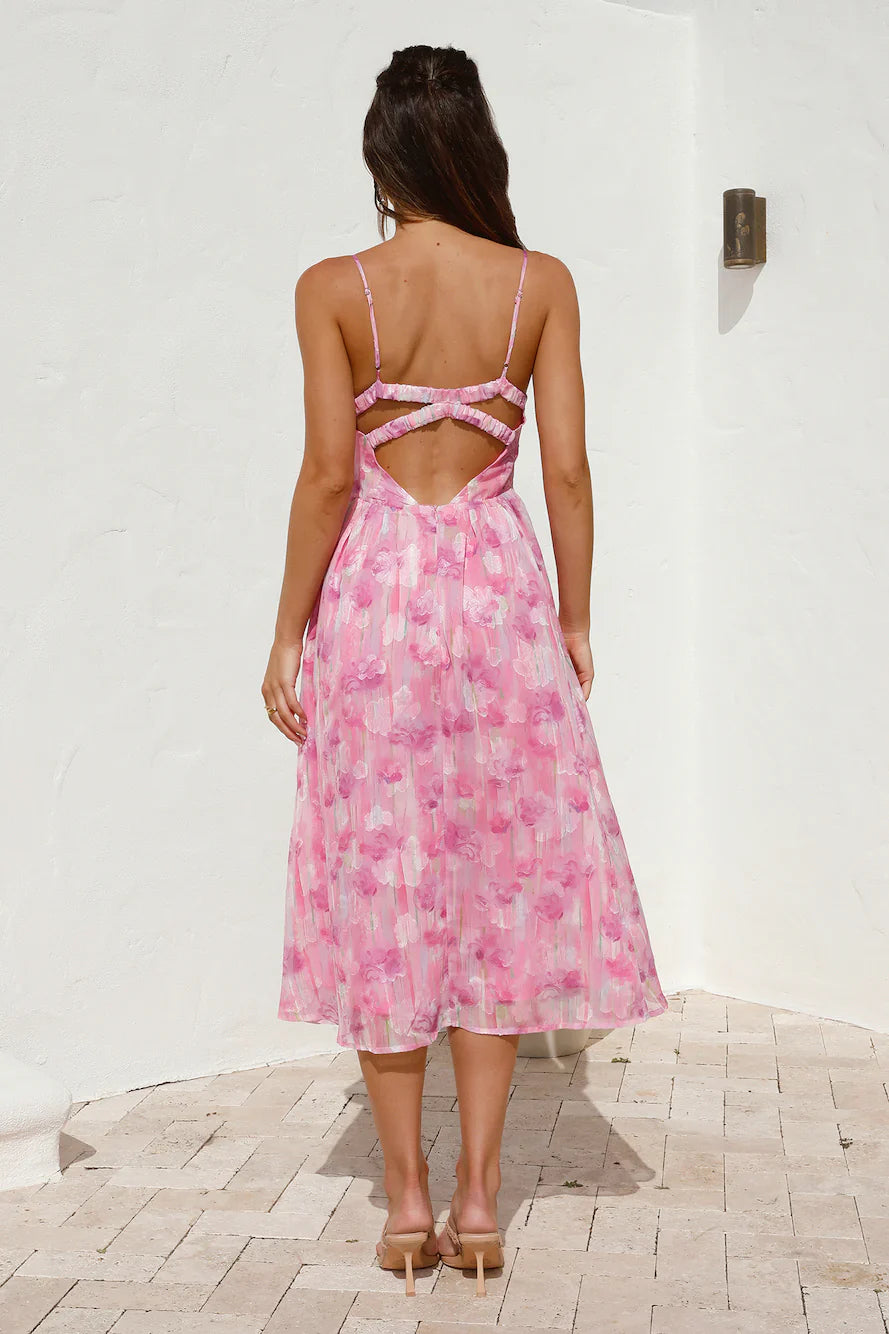 Make fairytale stories come to like while wearing the Fairytale Daydreams Midi Dress in Pink. This flowy dress pairs stunningly with strappy heels and gold adornments.