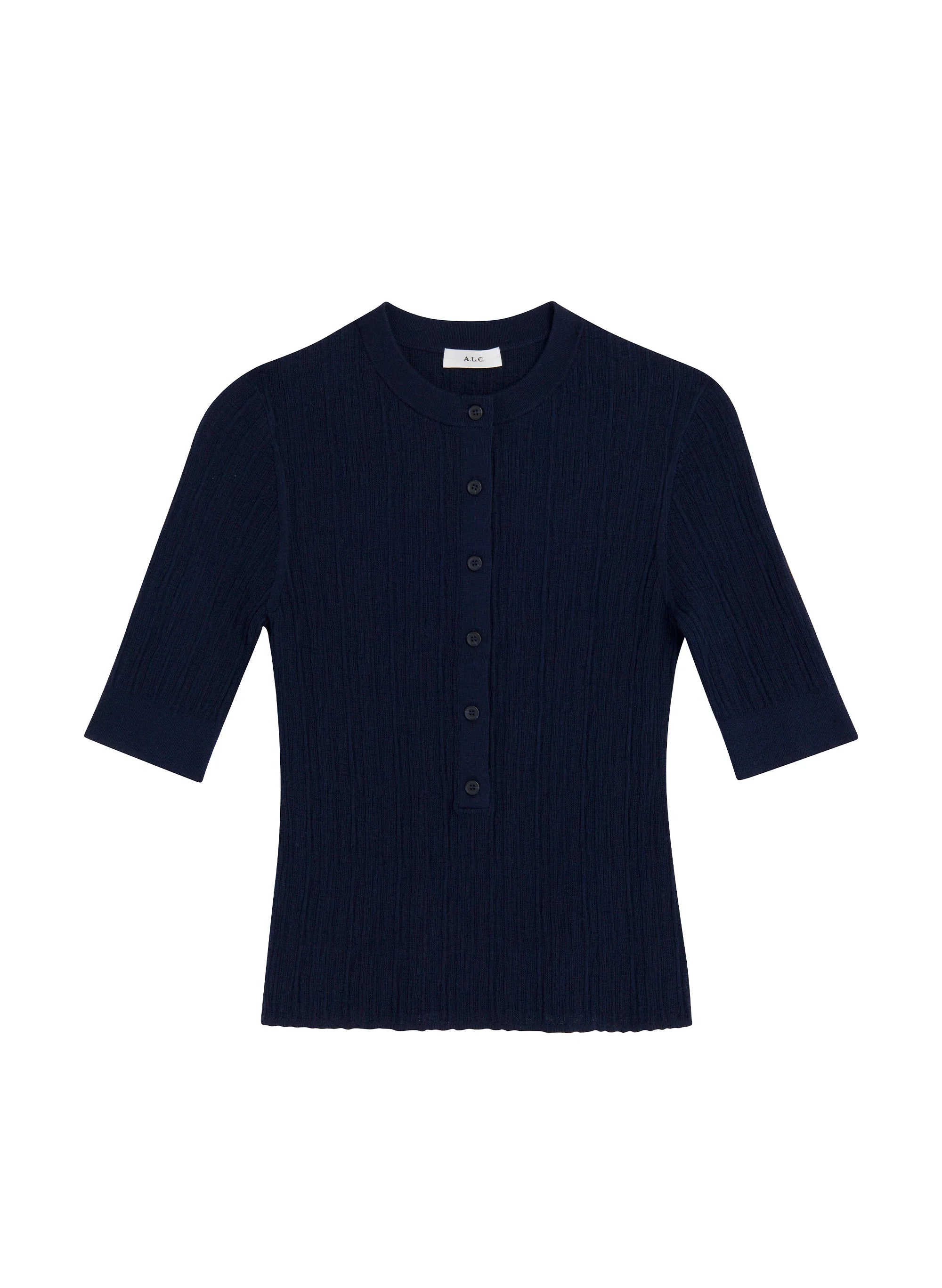 The Fisher Top is knitted from fine gauge cotton-blend yarn in a deep navy hue. This round-neck silhouette features a button-down placket and 3/4 sleeves. lending a sporty and textural touch to any look. Shop Tops