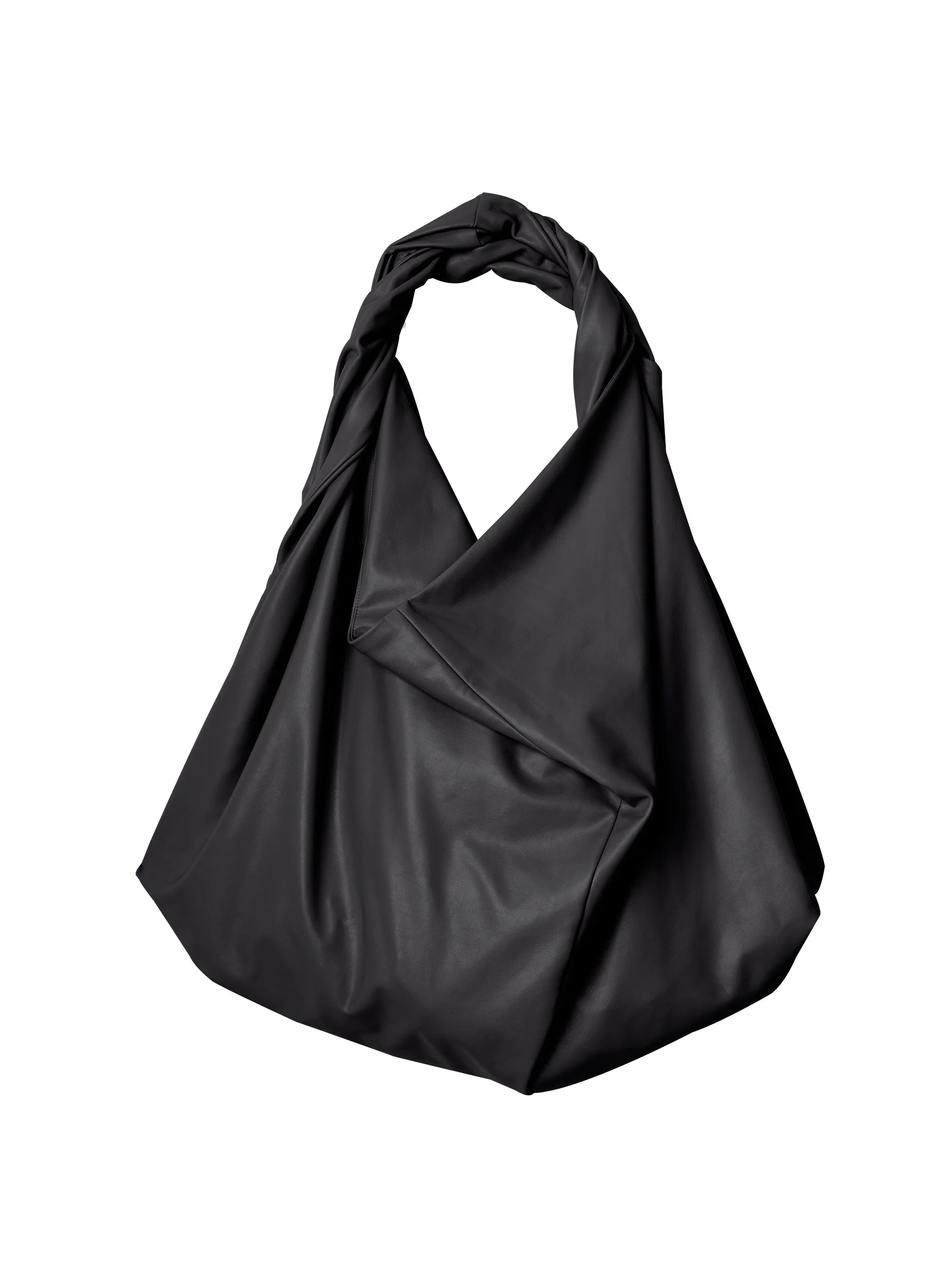 The Leo bag is crafted from buttery vegan leather and rendered in classic black. The ultra-roomy silhouette boasts wide straps and can be worn over the shoulder. or carried as an oversized clutch. Shop Bags