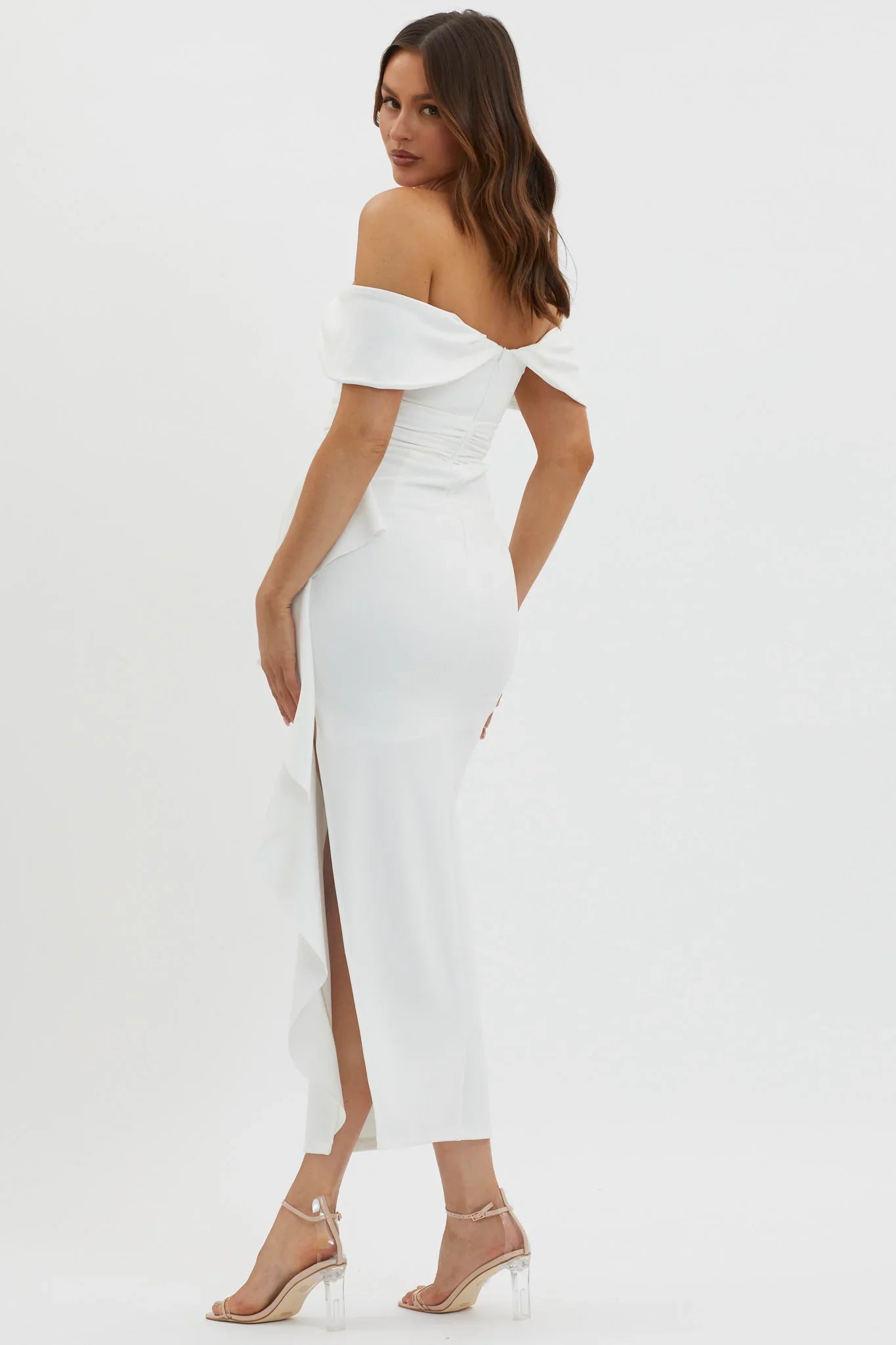 Make an entrance in our stunning Lillianne maxi dress. Featuring a chic, off-shoulder style and cascading ruffle detail in the side. Perfect for a bridal shower or special event. Team it with strappy heels and a clutch for a look we are loving.