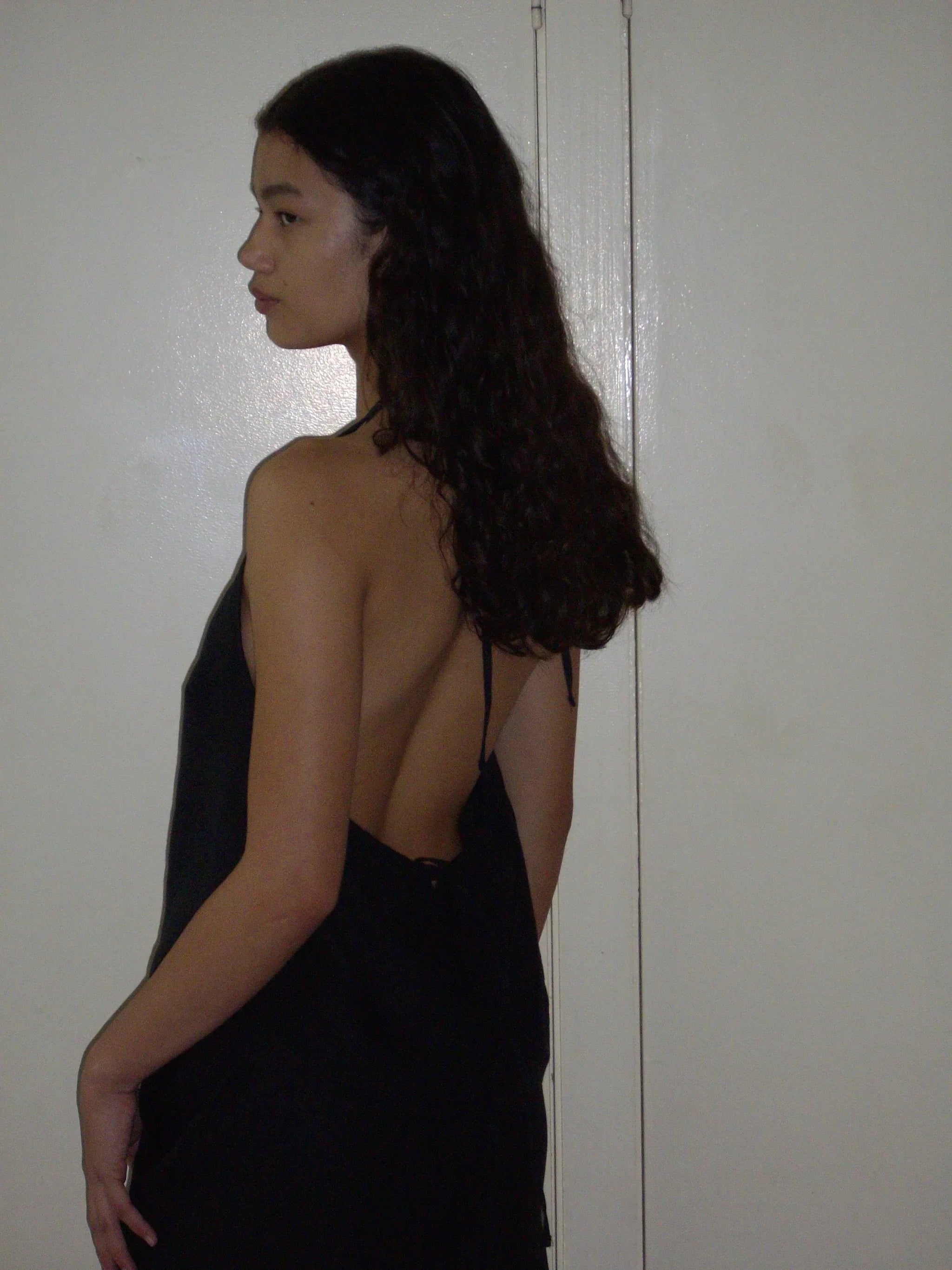 relaxed halter top features flattering v neckline. centre bust pleats and adjustable backline with drawcord tie closure