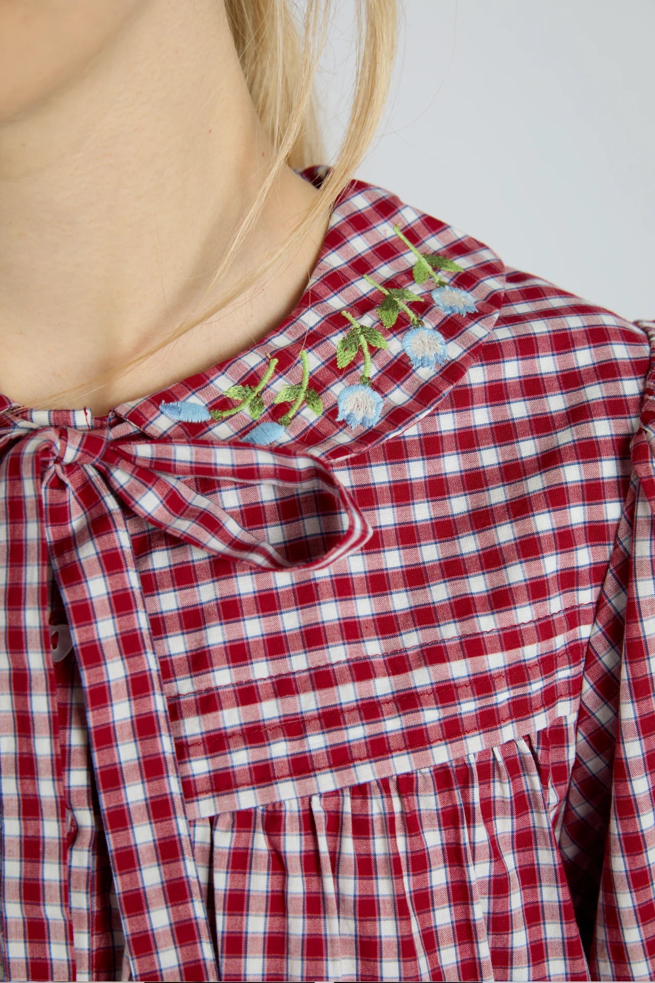 Our Mila gingham blouse is all about its details; heart-shaped buttons. delicate embroidery. a cute tie neck. It's made from 100% organic cotton and it fits true to size.