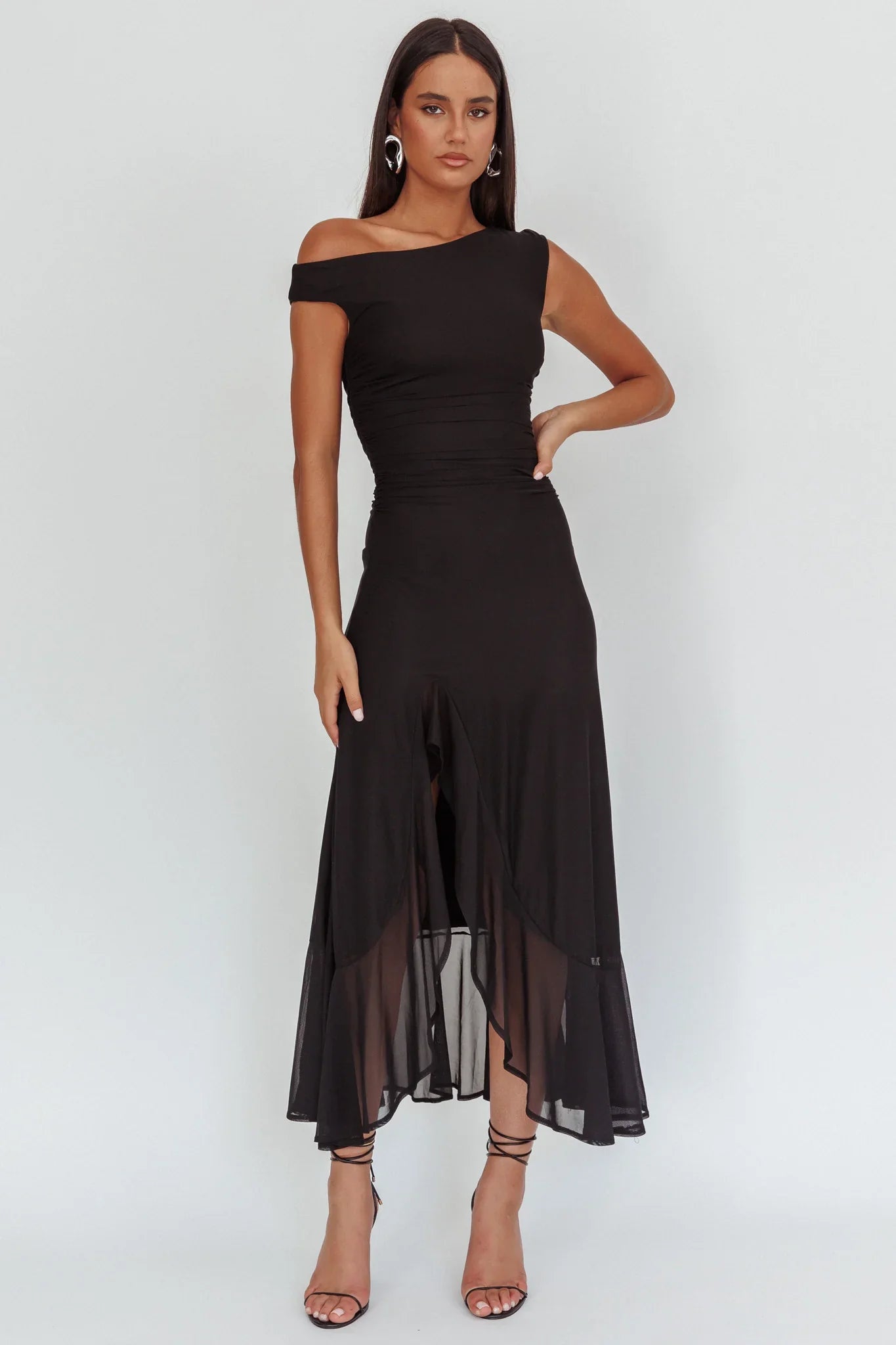 You'll be swept off your feet in our dreamy Moonlit Magic maxi dress. It features an asymmetric, off-shoulder neckline and a sexy, thigh-high leg split. It's perfect for a birthday dinner or special celebration. Team it with kitten heels and a clutch for a super cute look.