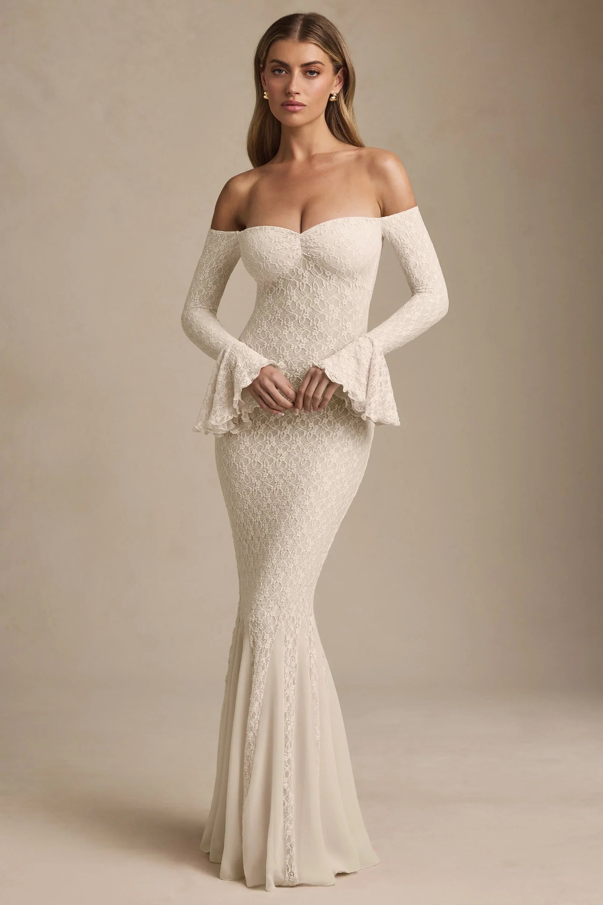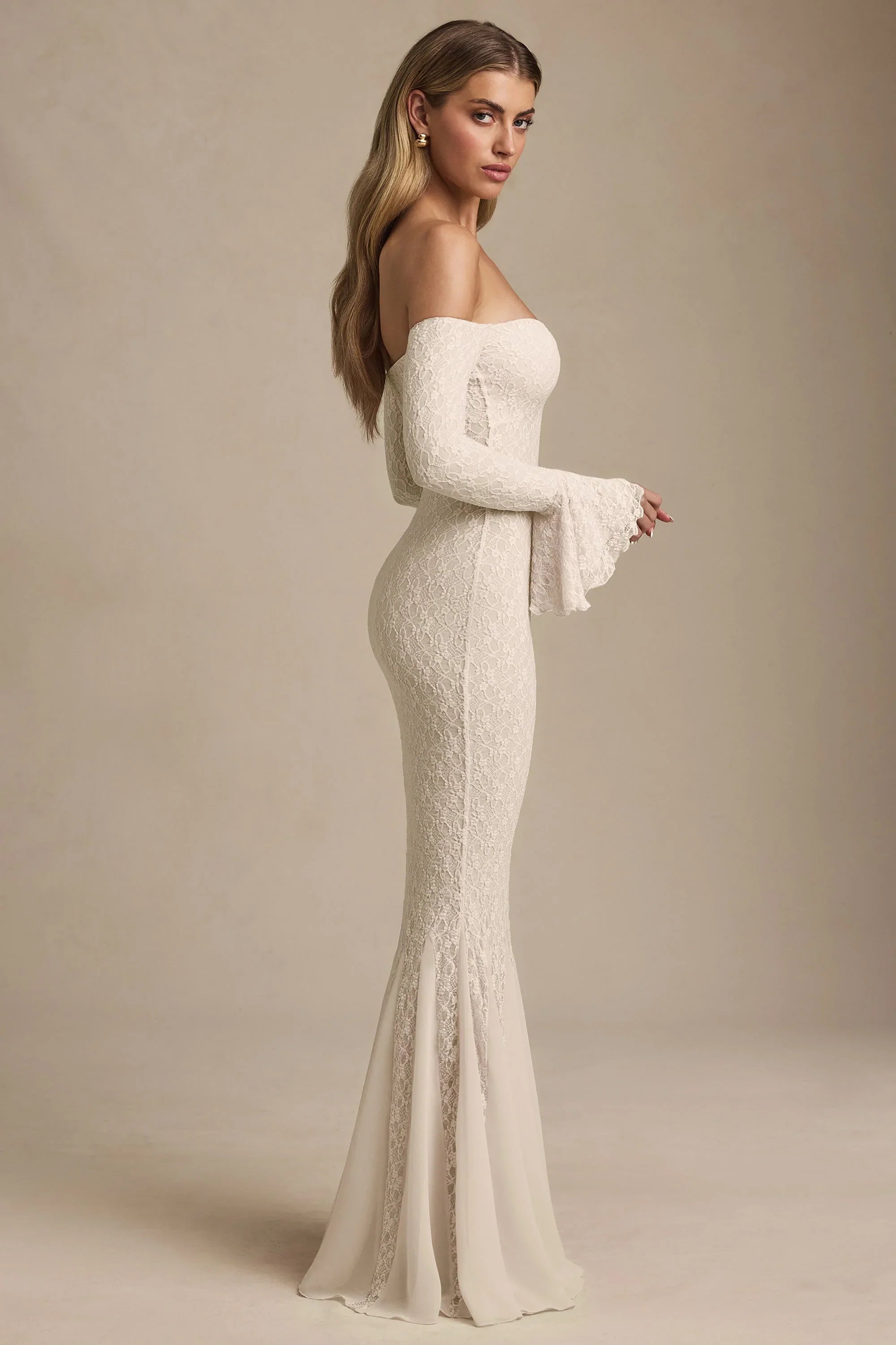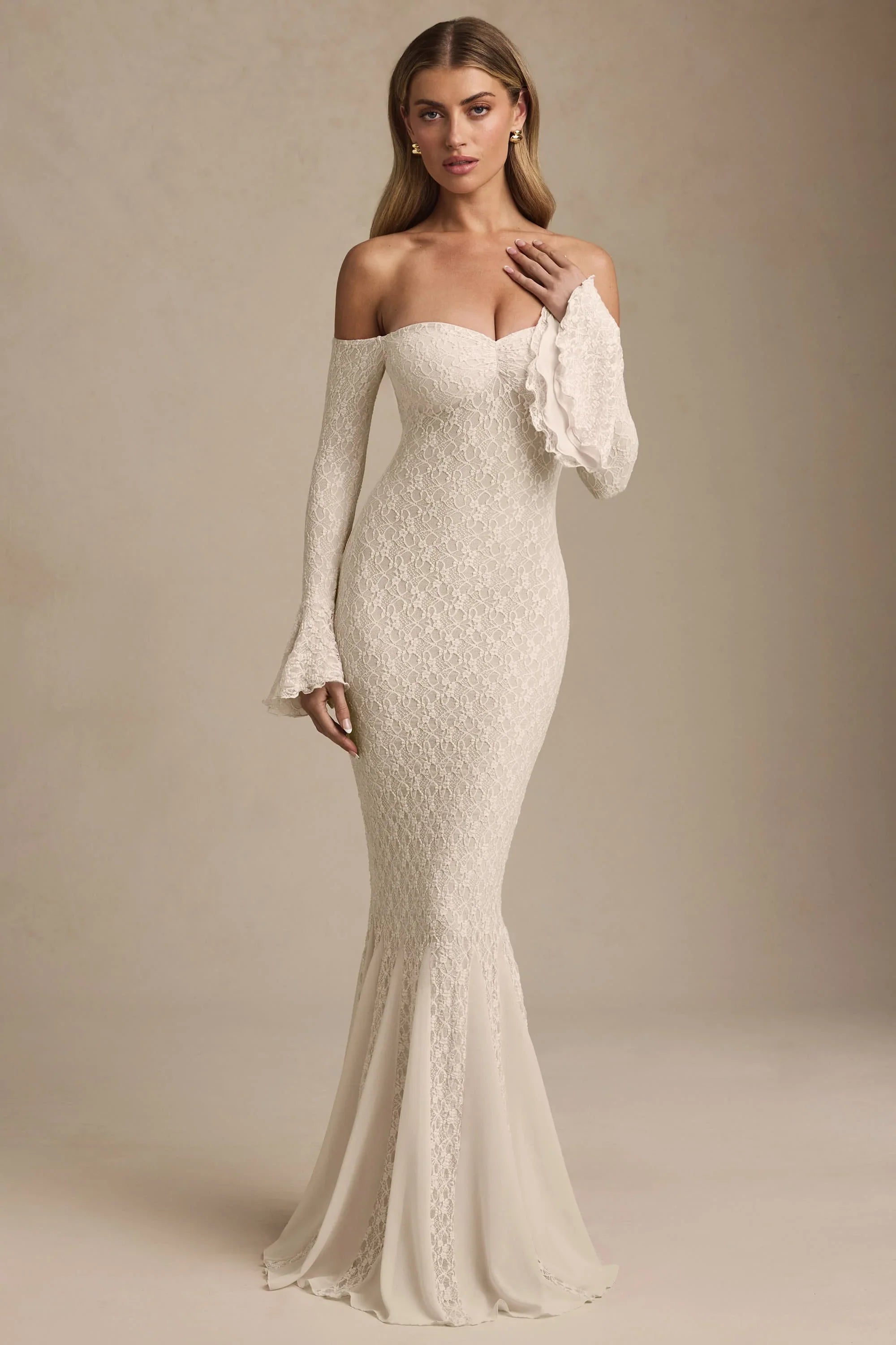 Romantic silhouettes, best served under the sun. Crafted from premium stretch lace with a soft, sheer jersey lining, the Verena maxi dress is cut to a figure-hugging fishtail silhouette. It’s framed with an off-shoulder sweetheart neckline and long fitted sleeves with delicate ruffled cuffs. The contrasting godet pleats create stunning movement with every step.