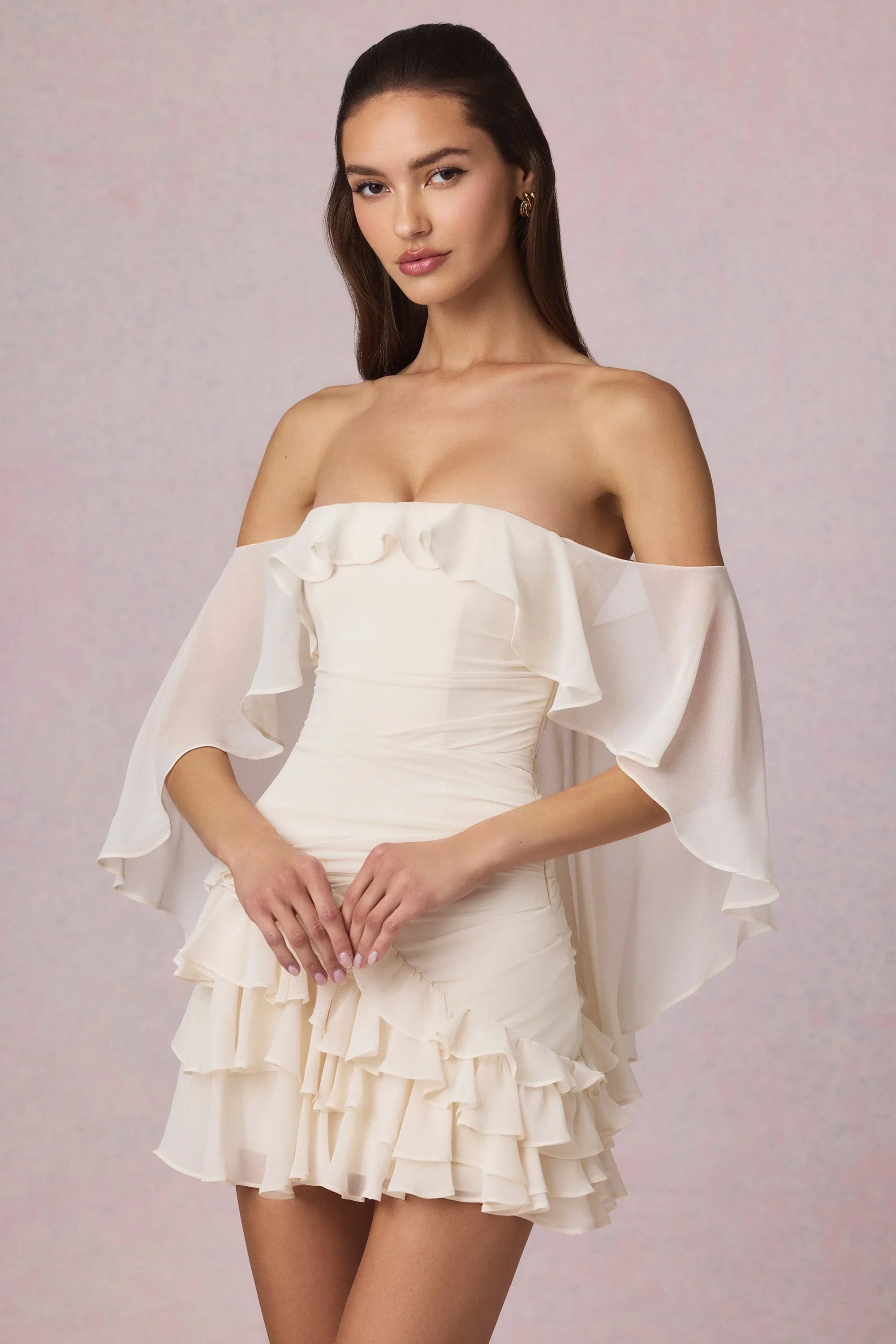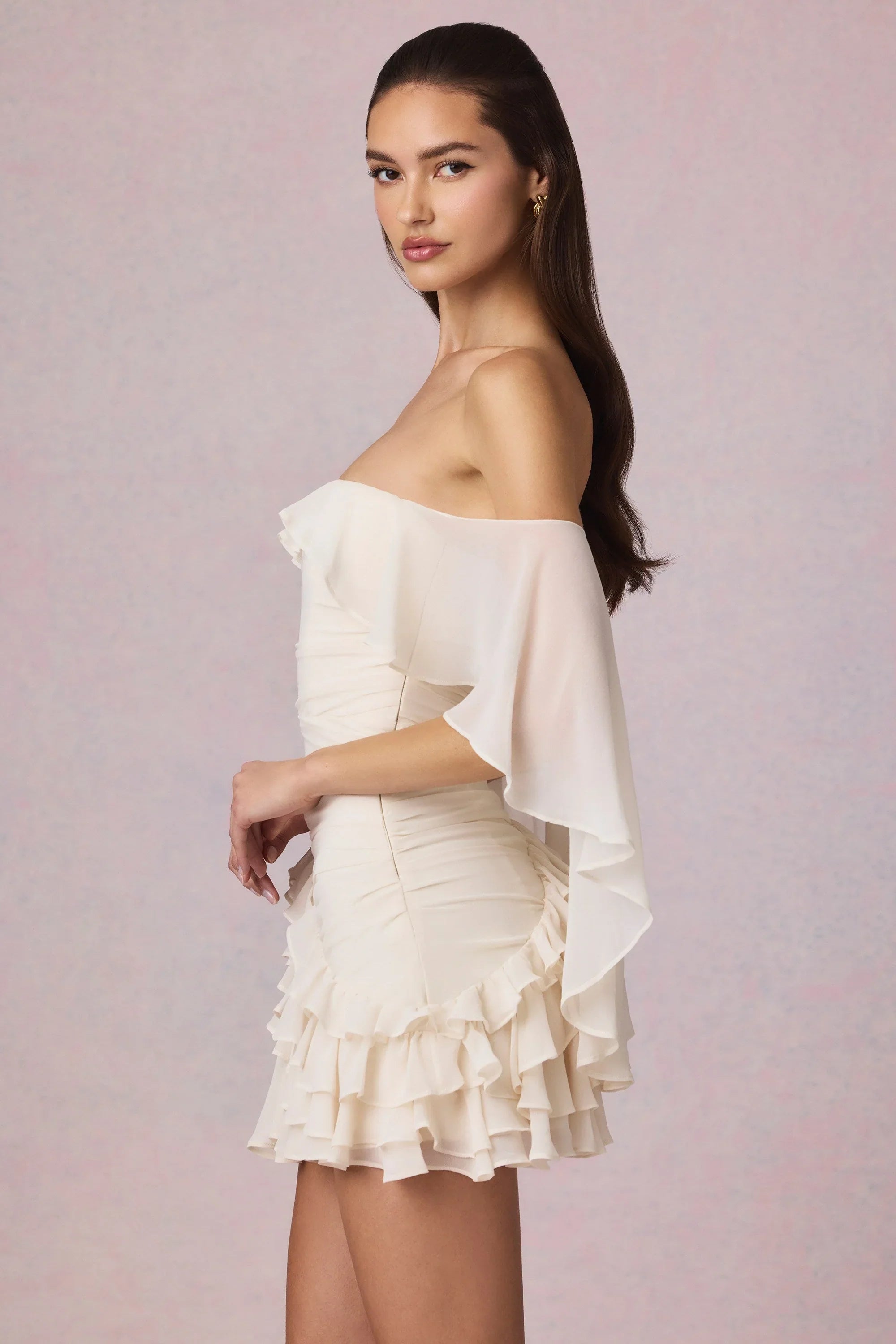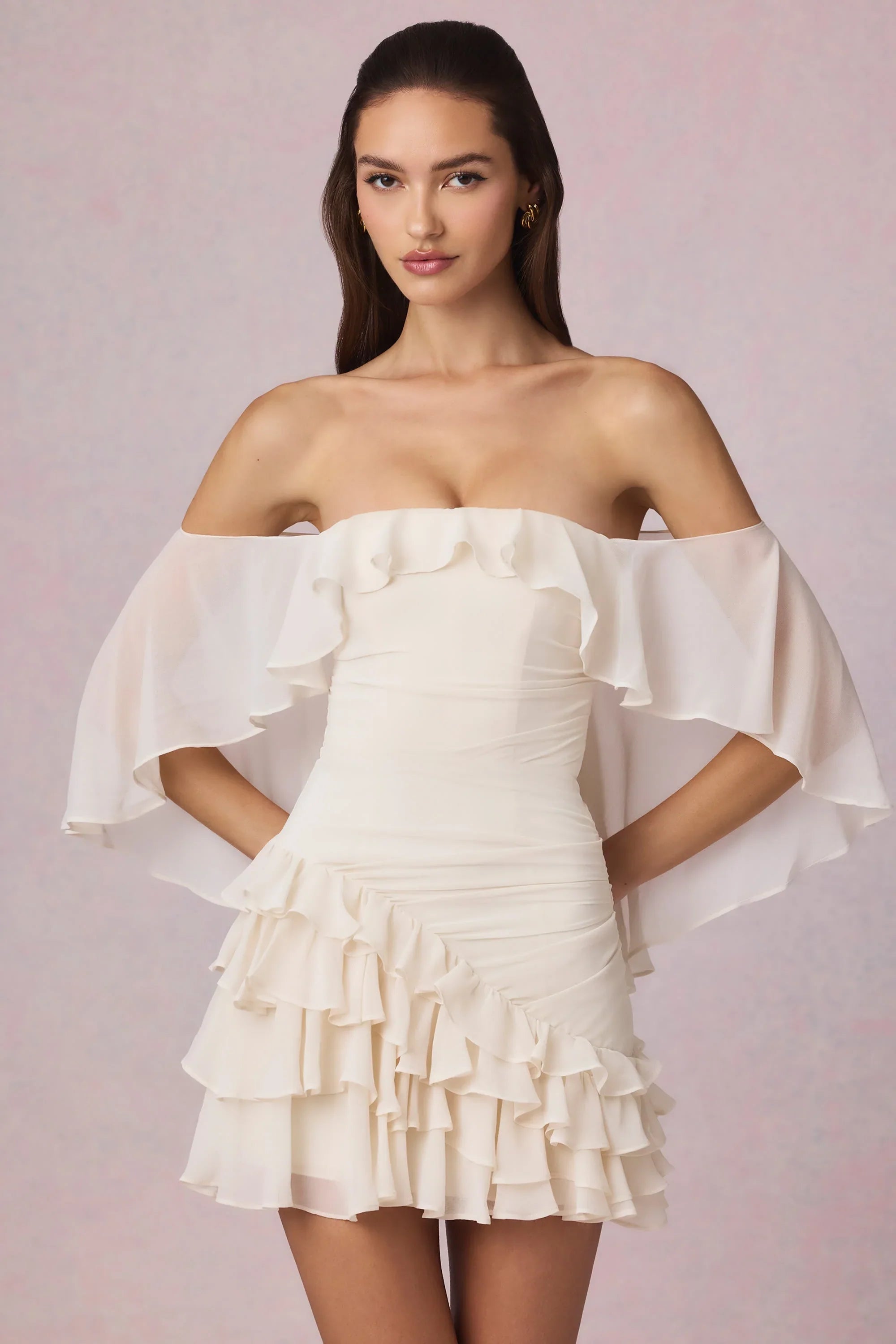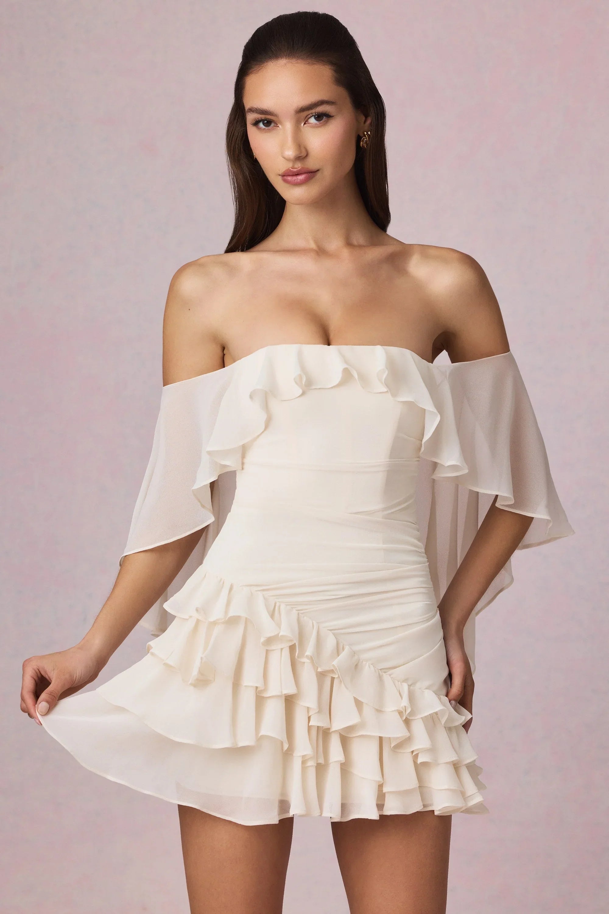 Ethereal and timeless, the Birdie mini dress is crafted from lightweight chiffon and framed with an off-shoulder cape-inspired overlay that creates dynamic movement with every step. Its cut to a universally flattering A-line silhouette elevated with precise diagonal ruching and asymmetric ruffle detailing at the skirt. The bandeau neckline is secured with internal silicone grip tape for enhanced hold and it comes with detachable, adjustable straps for custom styling.