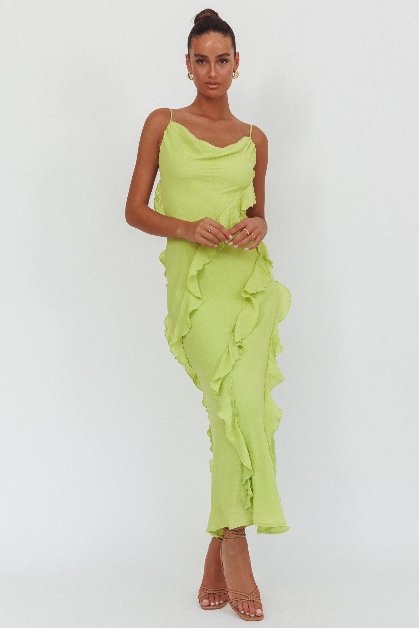 Captivate them in our Panama Bay maxi dress! It's sure to turn heads with its diagonal ruffle trim and chic cowl neckline. Perfect for a glamorous evening out, this dress is begging to be worn with statement, gold earrings, and a slicked-back bun for an unforgettable look.