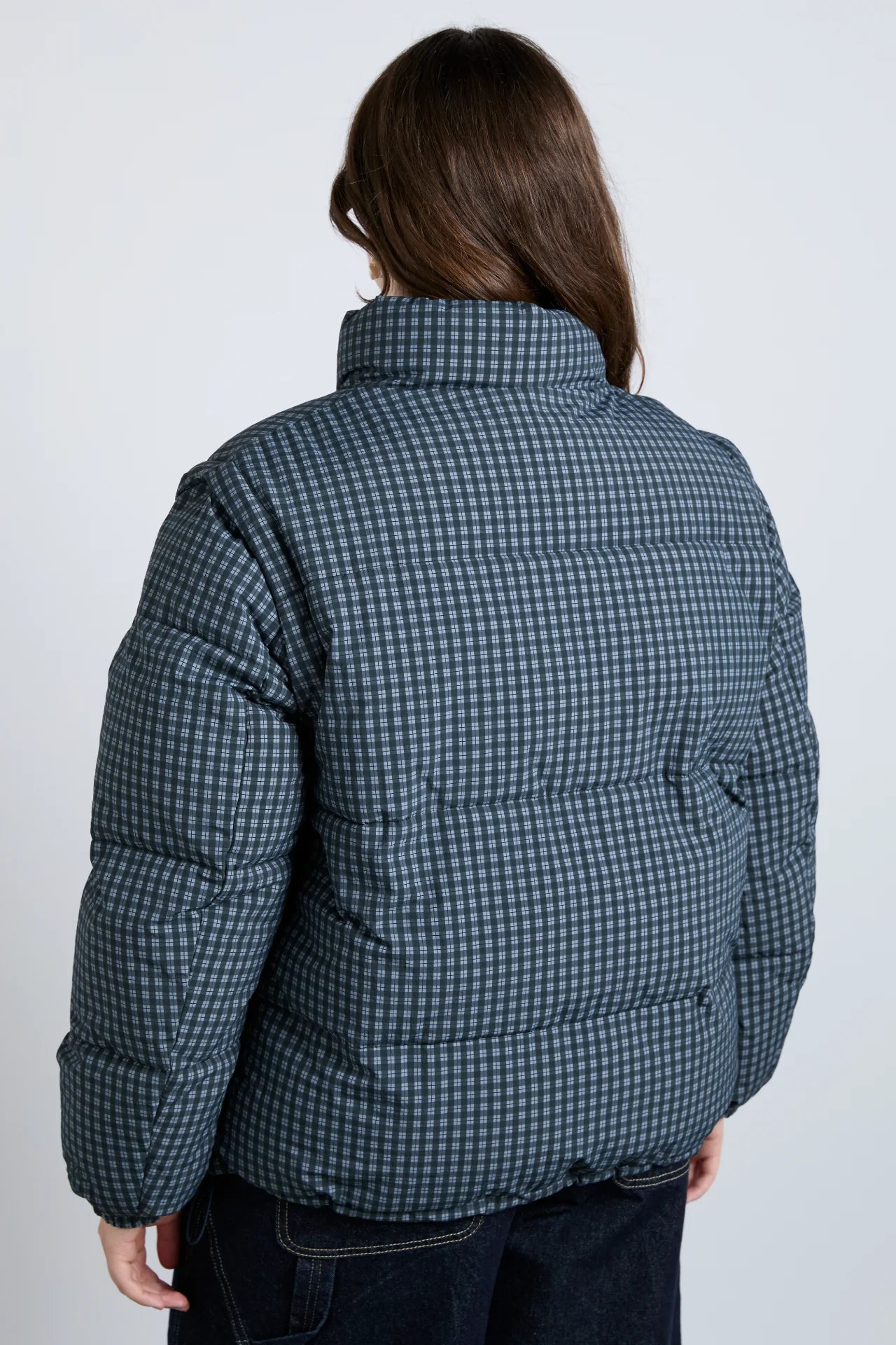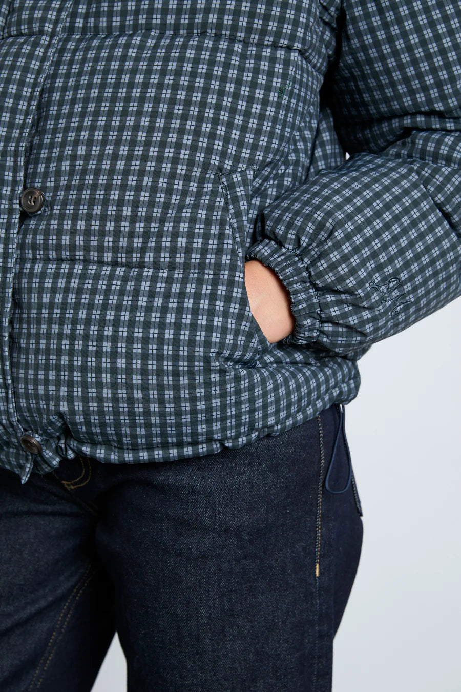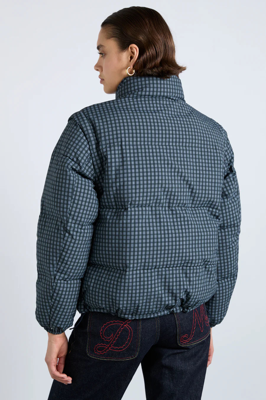 Our Pearl puffer in navy gingham boasts a high neck. subtle embroidery and cosy wadding that's ideal for the coming months.
