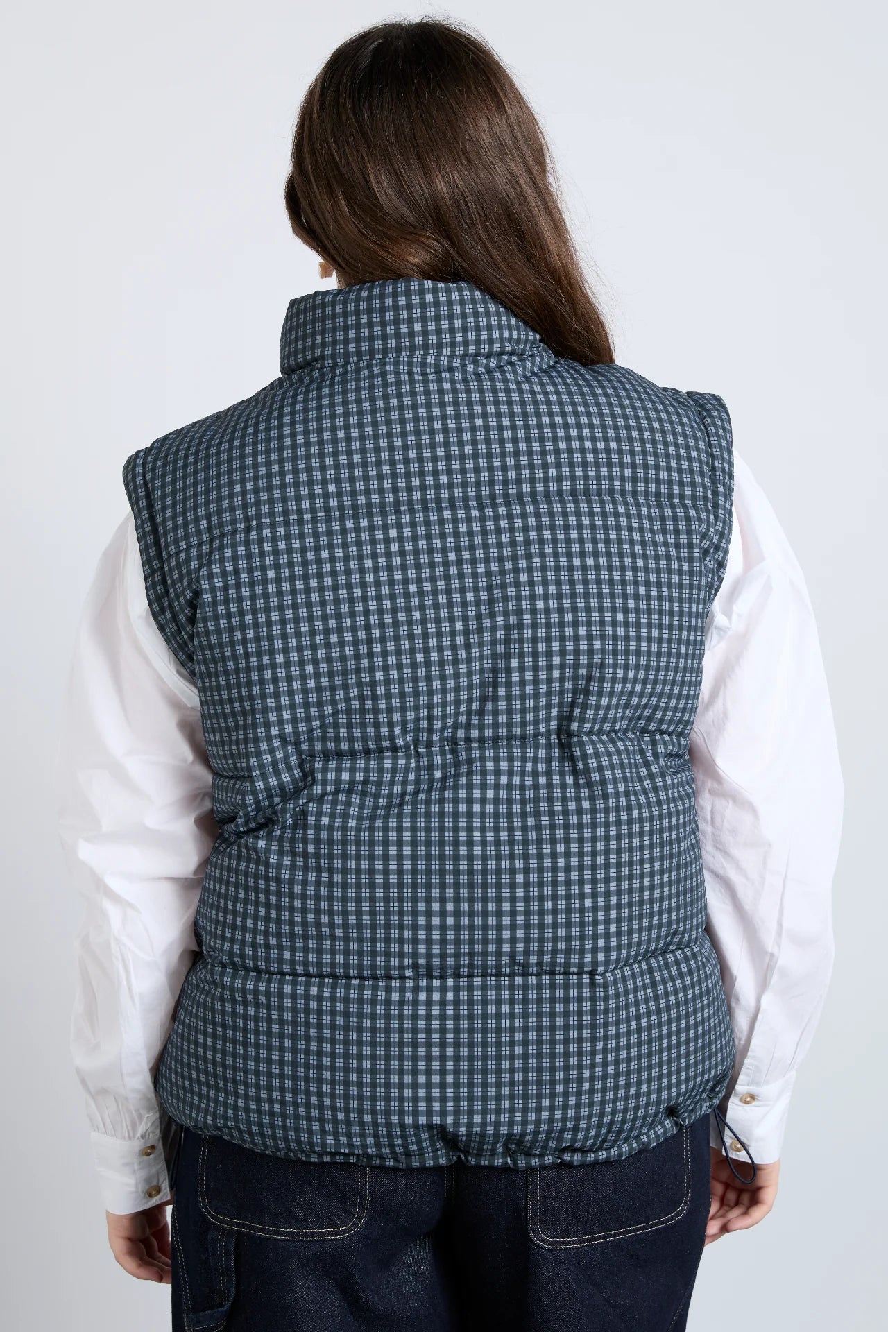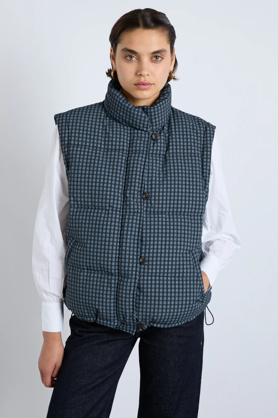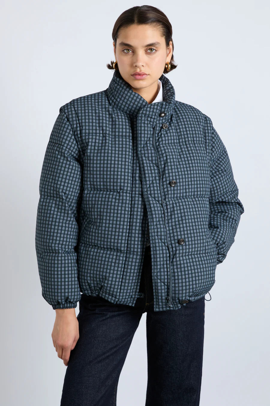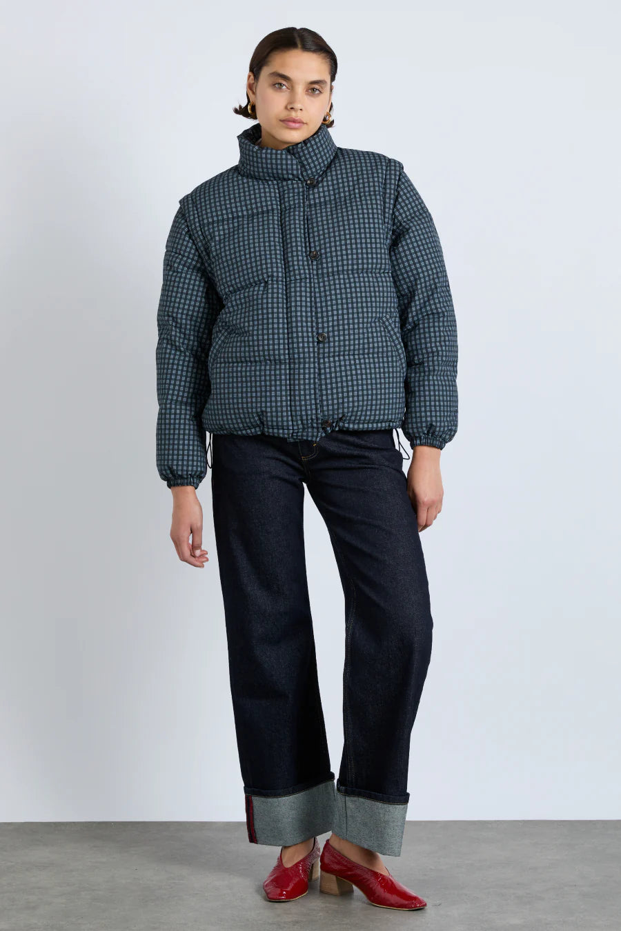 Our Pearl puffer in navy gingham boasts a high neck. subtle embroidery and cosy wadding that's ideal for the coming months.
