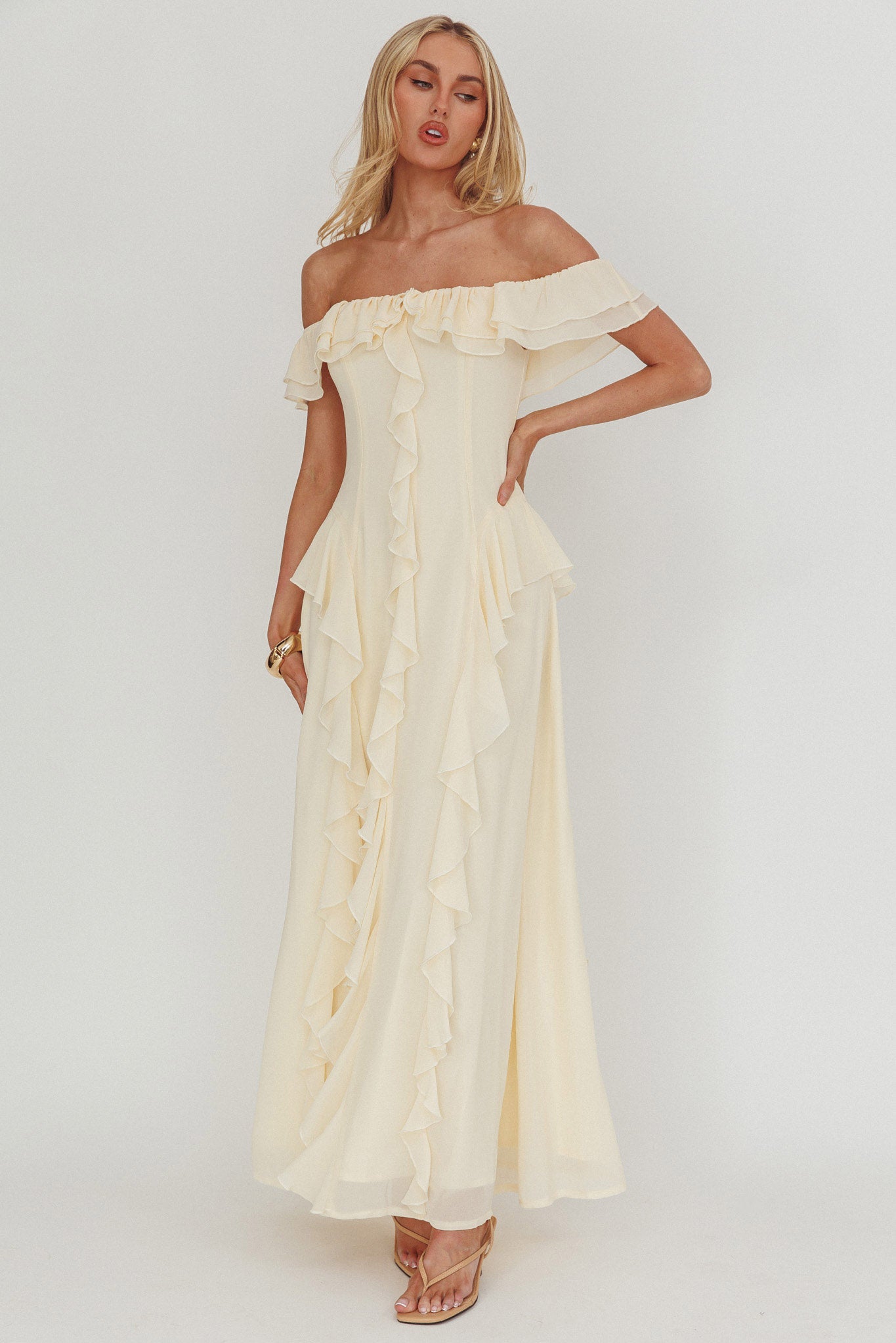 Make an impression in our stunning Scarlet maxi dress. It features an off-shoulder design with adorable ruffle trim throughout. It's perfect for Friday night dinner dates with your girls teamed with a saddle bag and mules for a chic look.