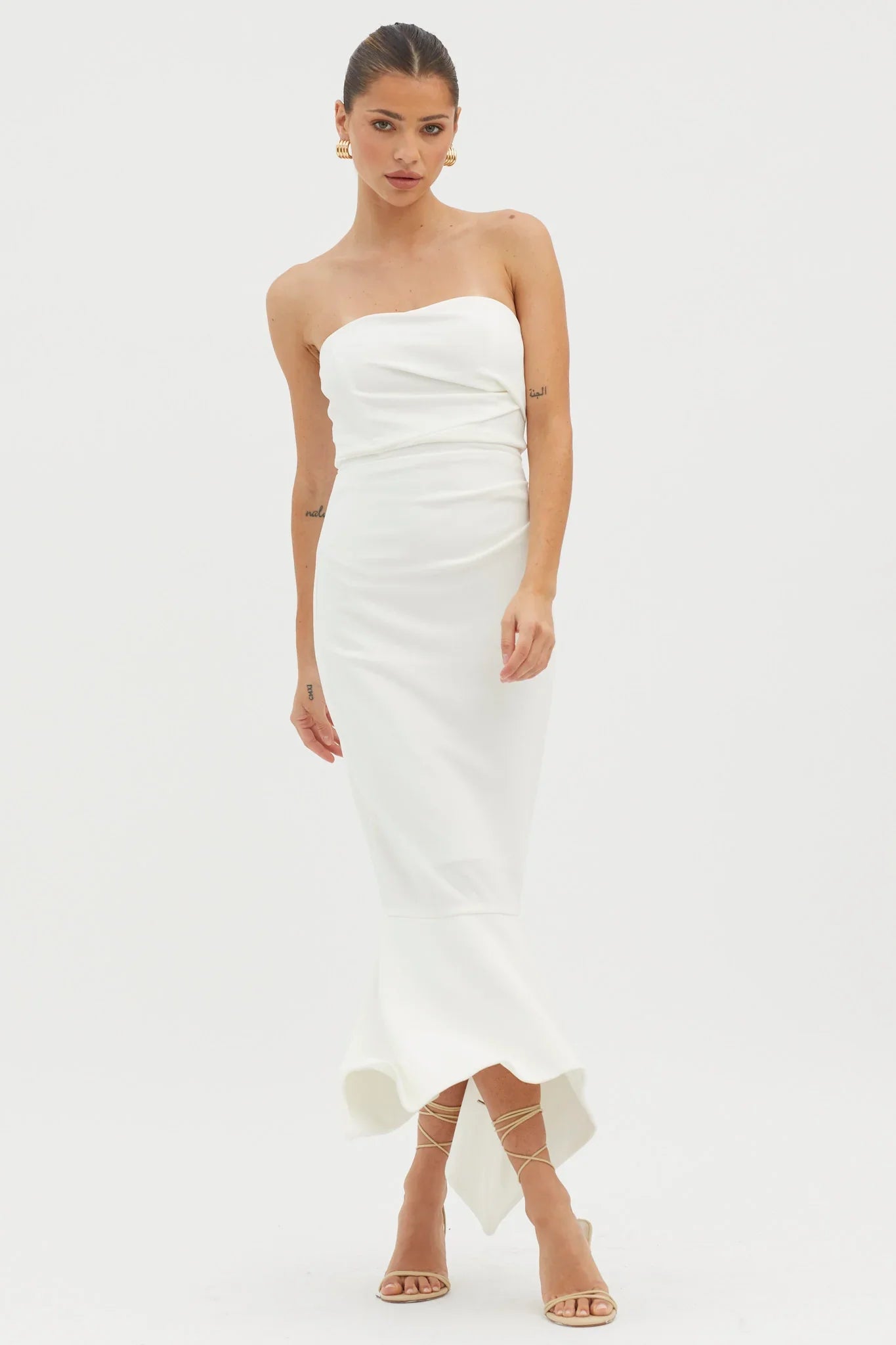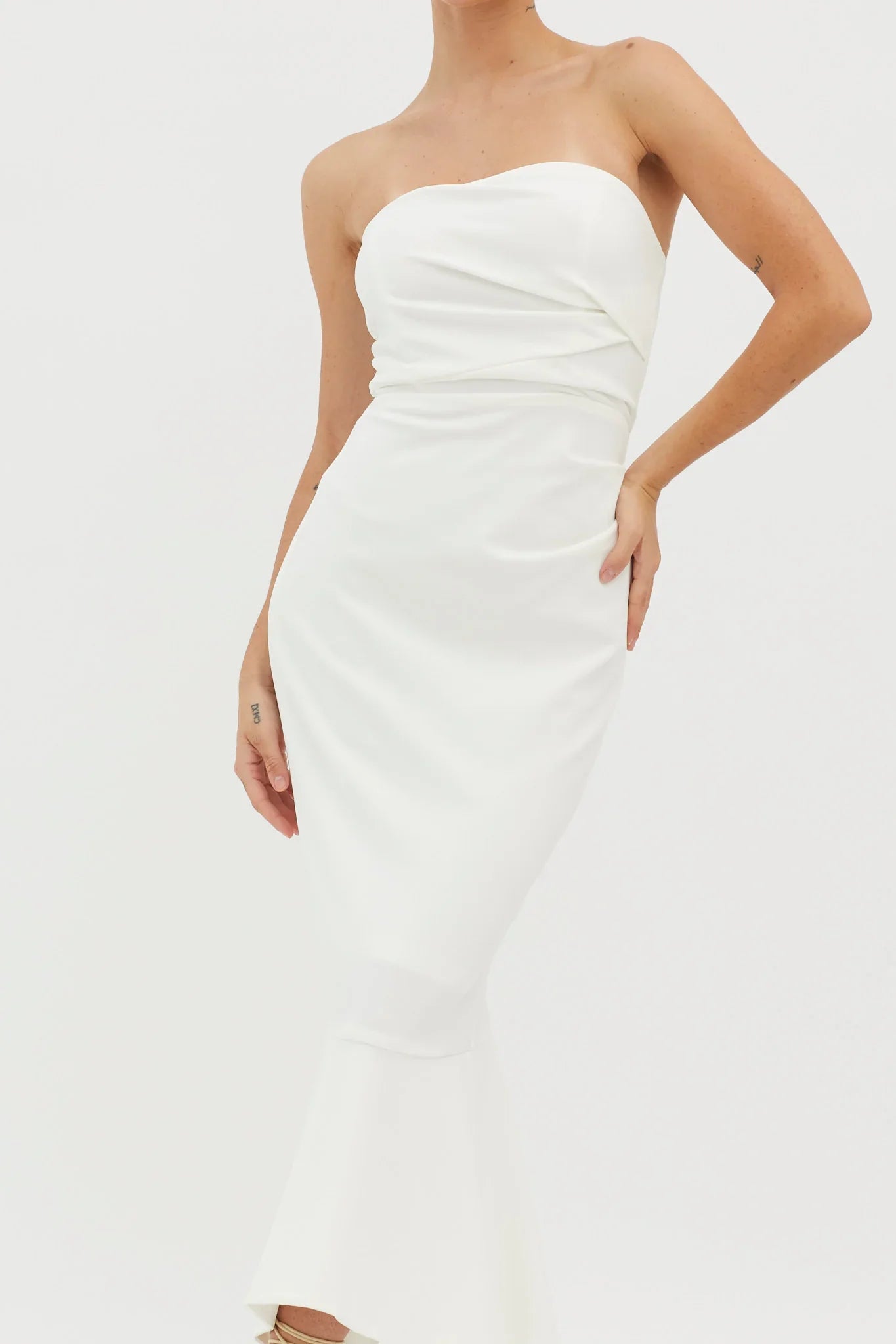 Make an entrance in our pretty Sharona midi dress. It features a classic, strapless neckline and gathering detail in the side and is perfect for the modern bride or an anniversary dinner with your love! Team it with nude heels and a clutch for a sophisticated look we are loving.