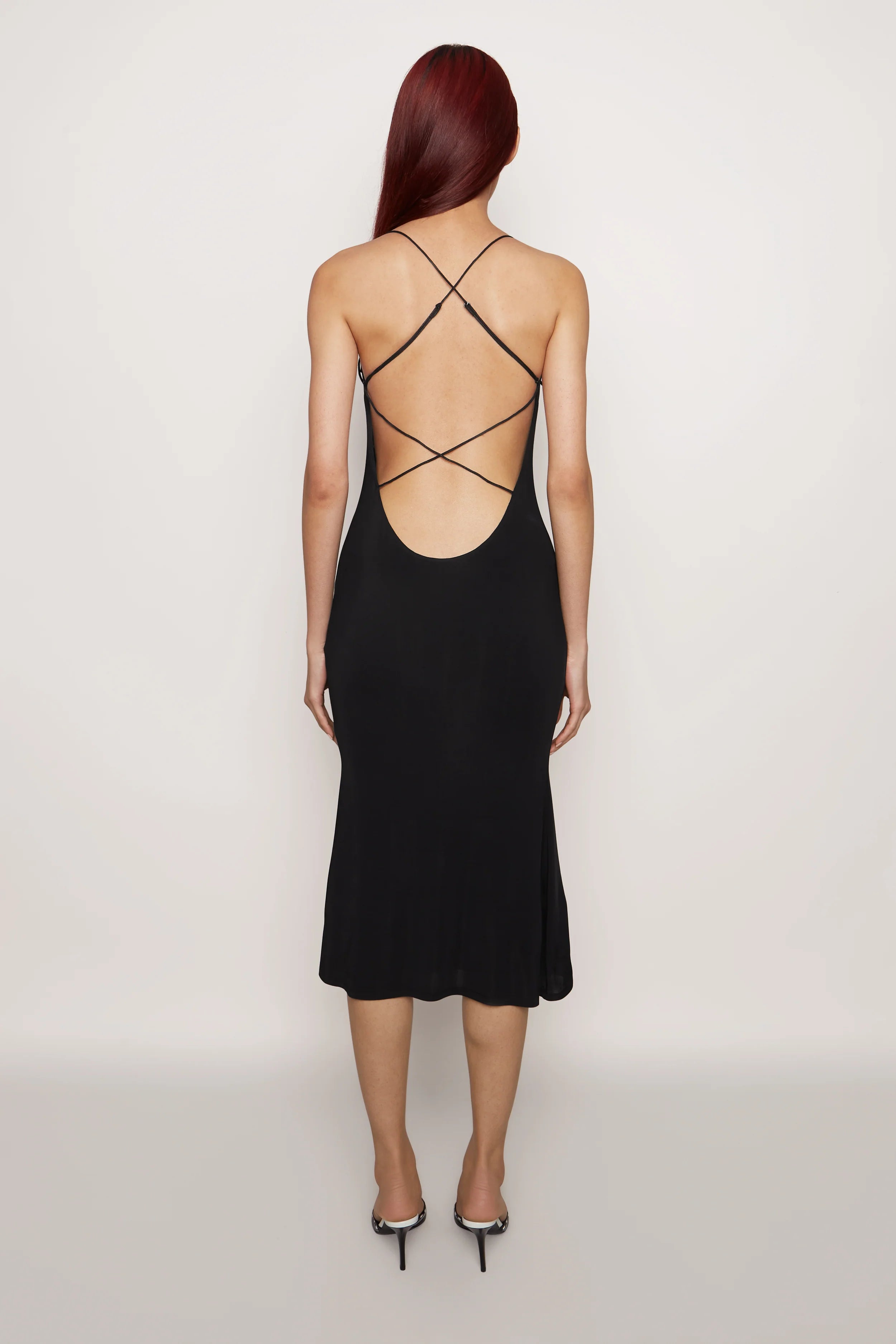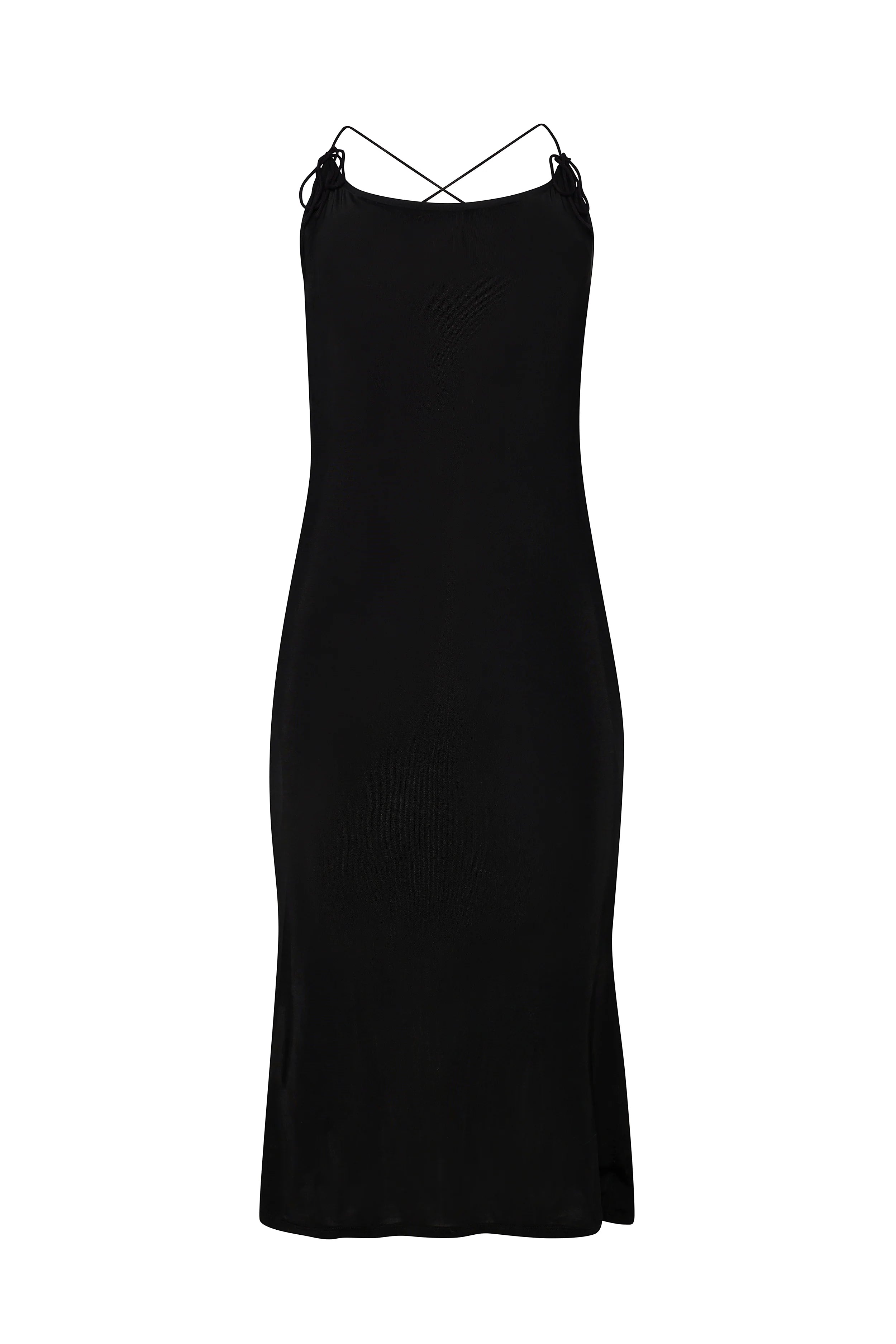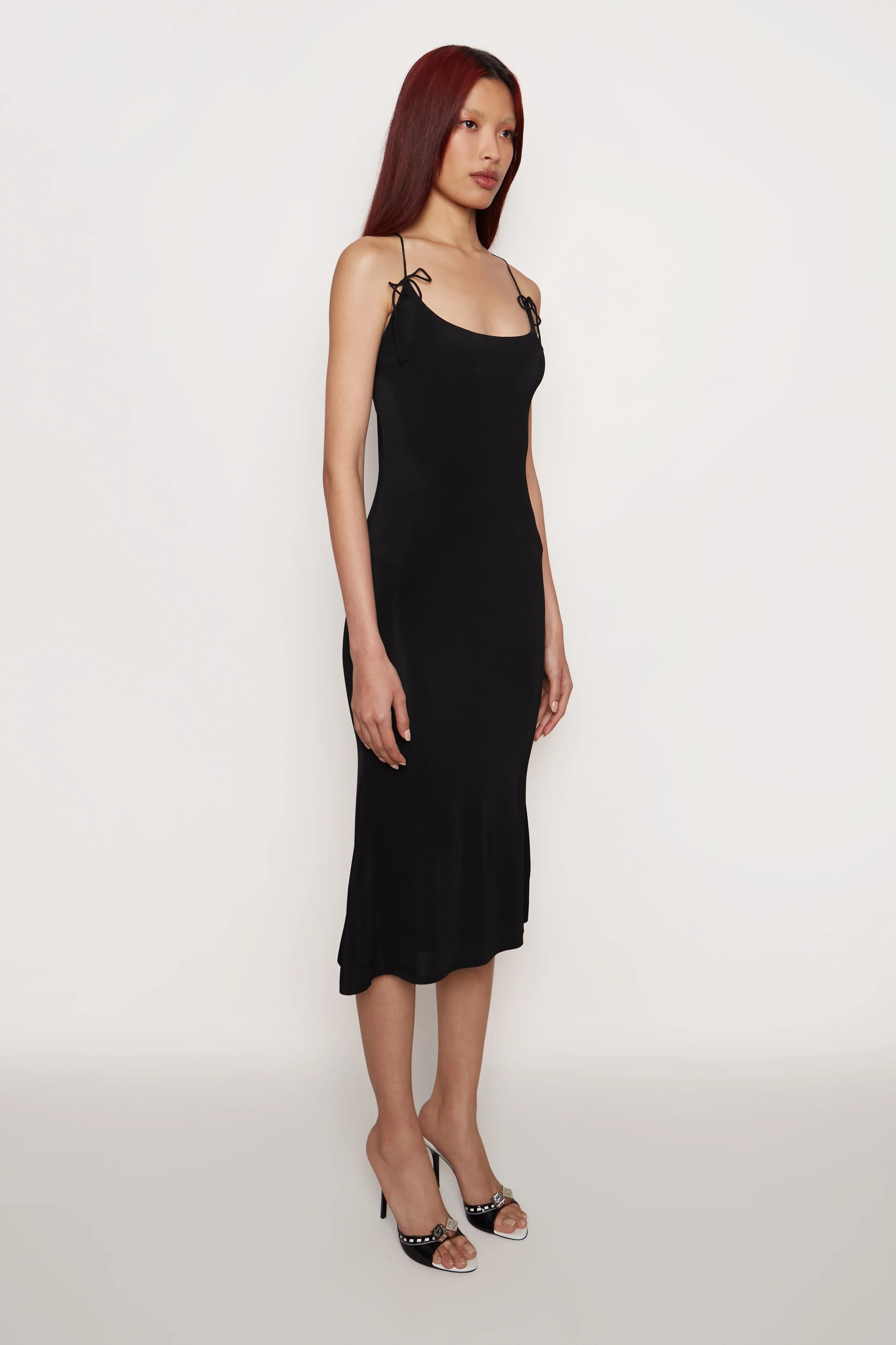 If you need just one black dress. our Slinky Midi Dress is it. Double-layer mesh construction lends the right amount of support while fitting close to hug the body. A low-rise strappy back allows for adjustable wear. and the bows at the front lend a sweet touch.