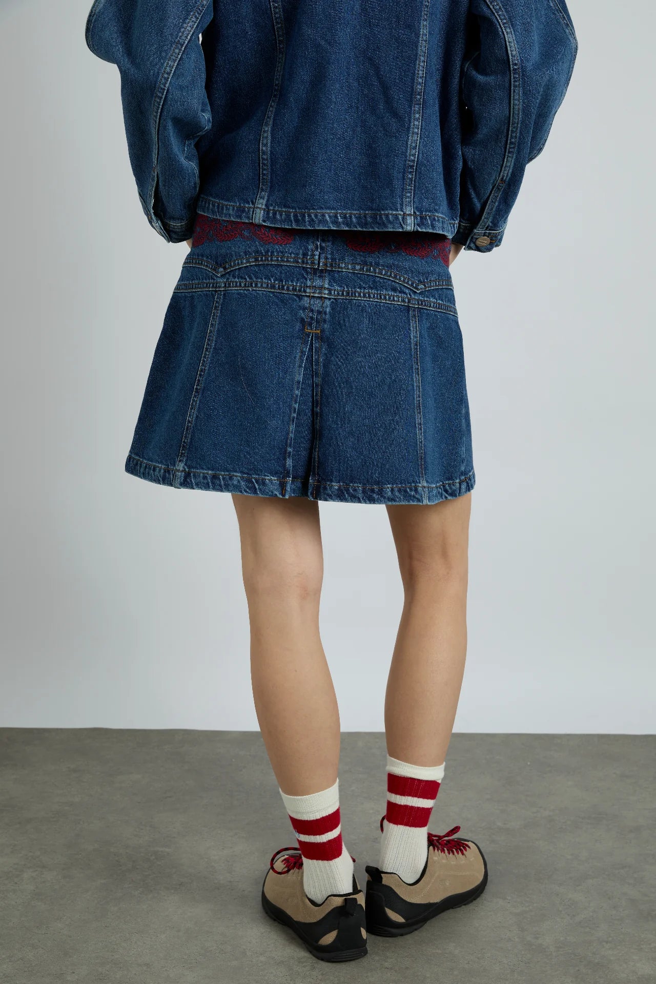 Our sloane skirt in vintage blue wash features Damson's signature red embroidery along the waist. with exaggerated pleat detailing at the front.