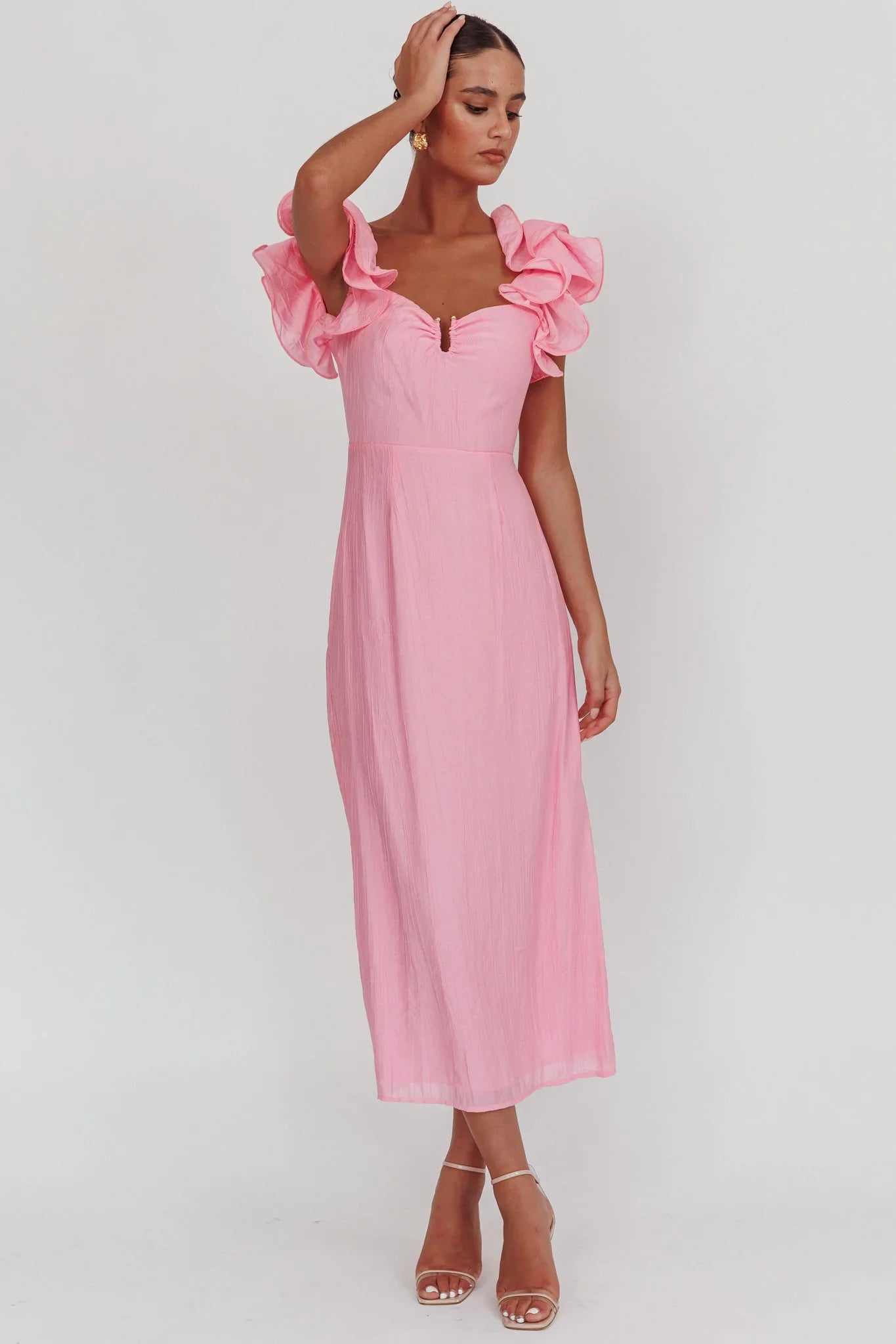 Turn heads in our gorgeous Sunday Dreams maxi dress. It features the sweetest ruffle straps and U hardware in the bust. It's perfect for a wedding or romantic anniversary dinner. Team it with strappy, nude tie-up heels and a clutch for an unforgettable look.