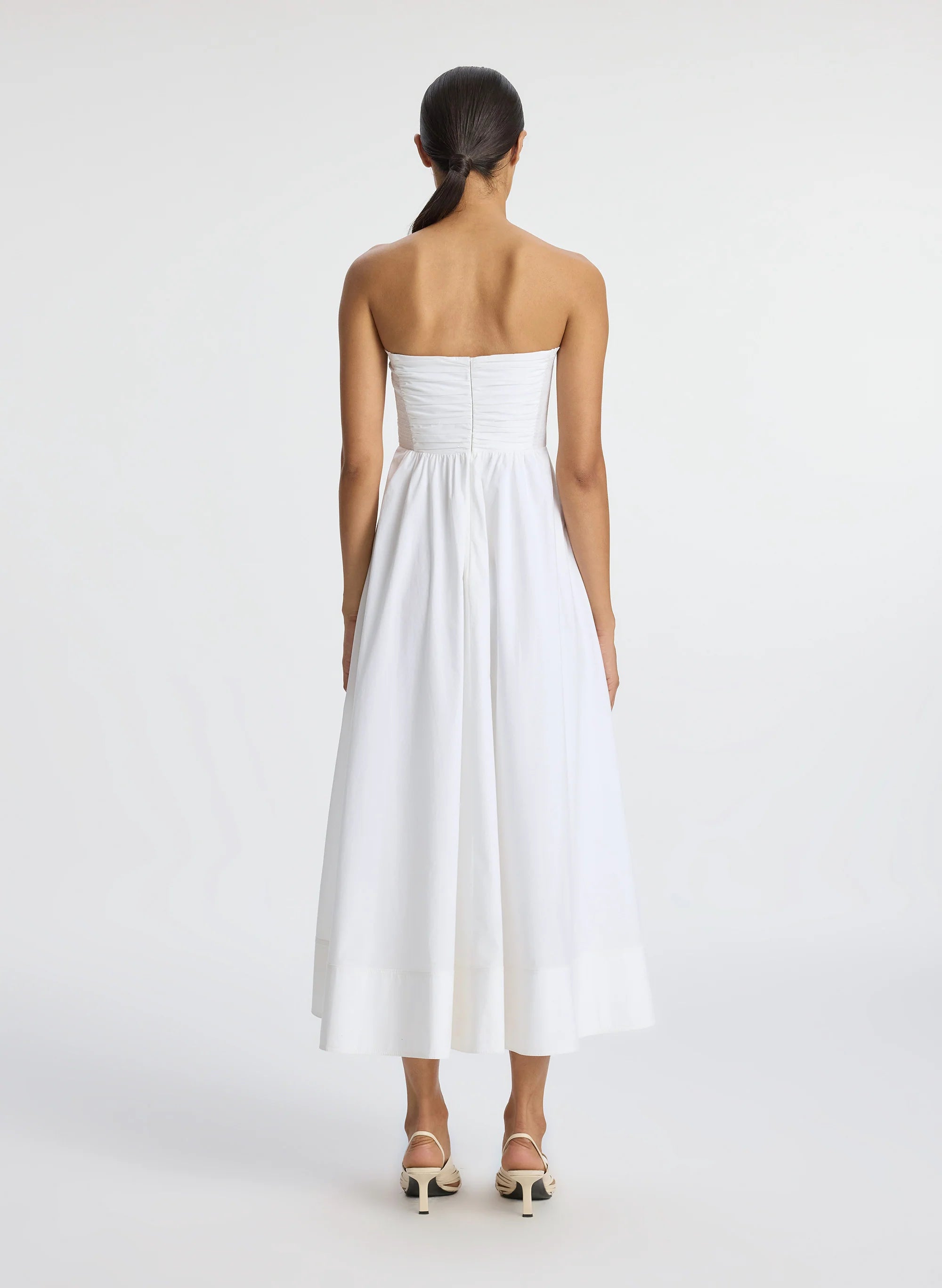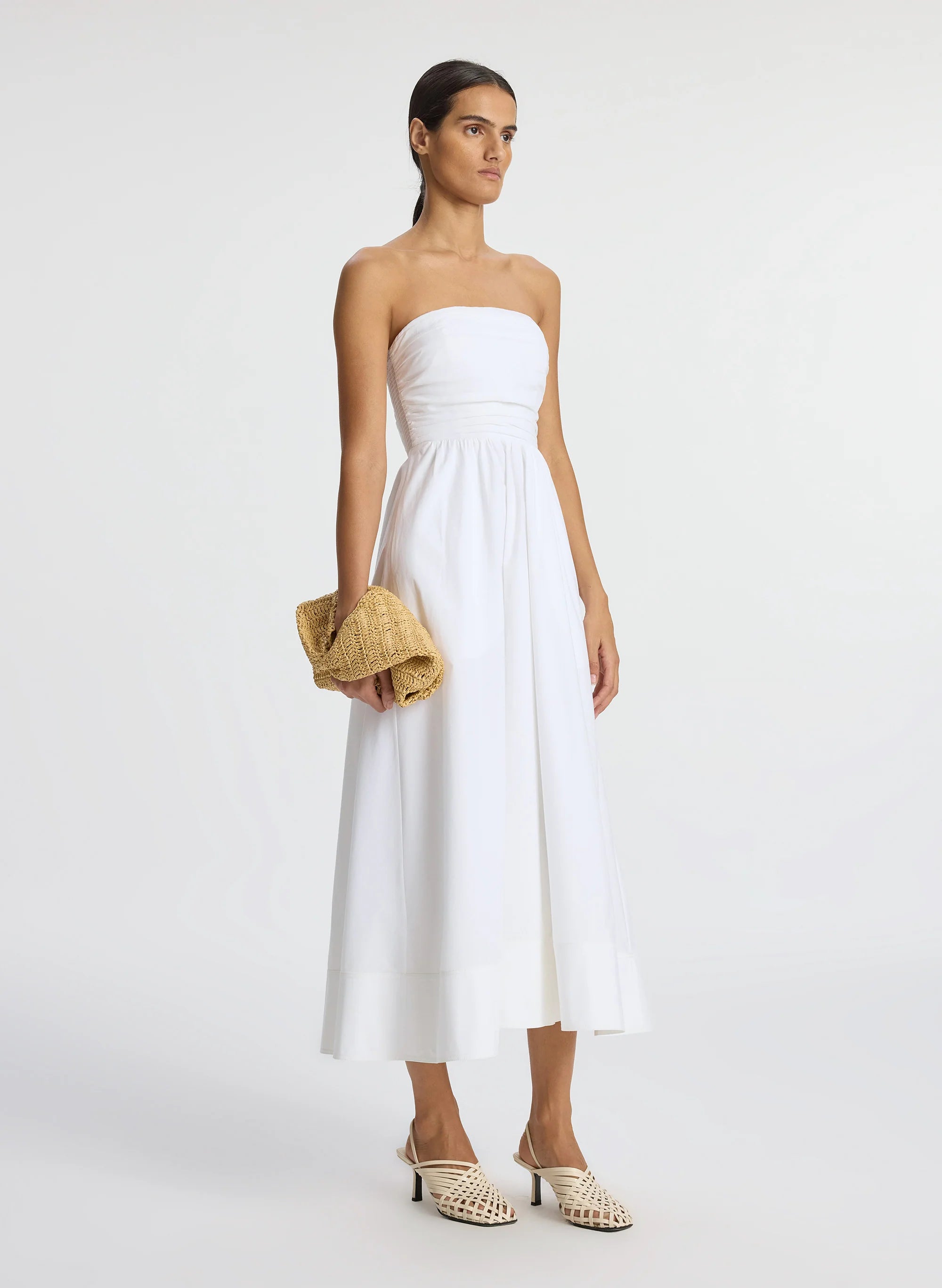 The Tate Dress is crafted from our easy day cotton fabric in timeless white. This strapless silhouette is beautifully pleated and gathered with smocking at the sides and a full midi skirt. Pockets and gum lining at the bodice complete the look. Shop Dresses