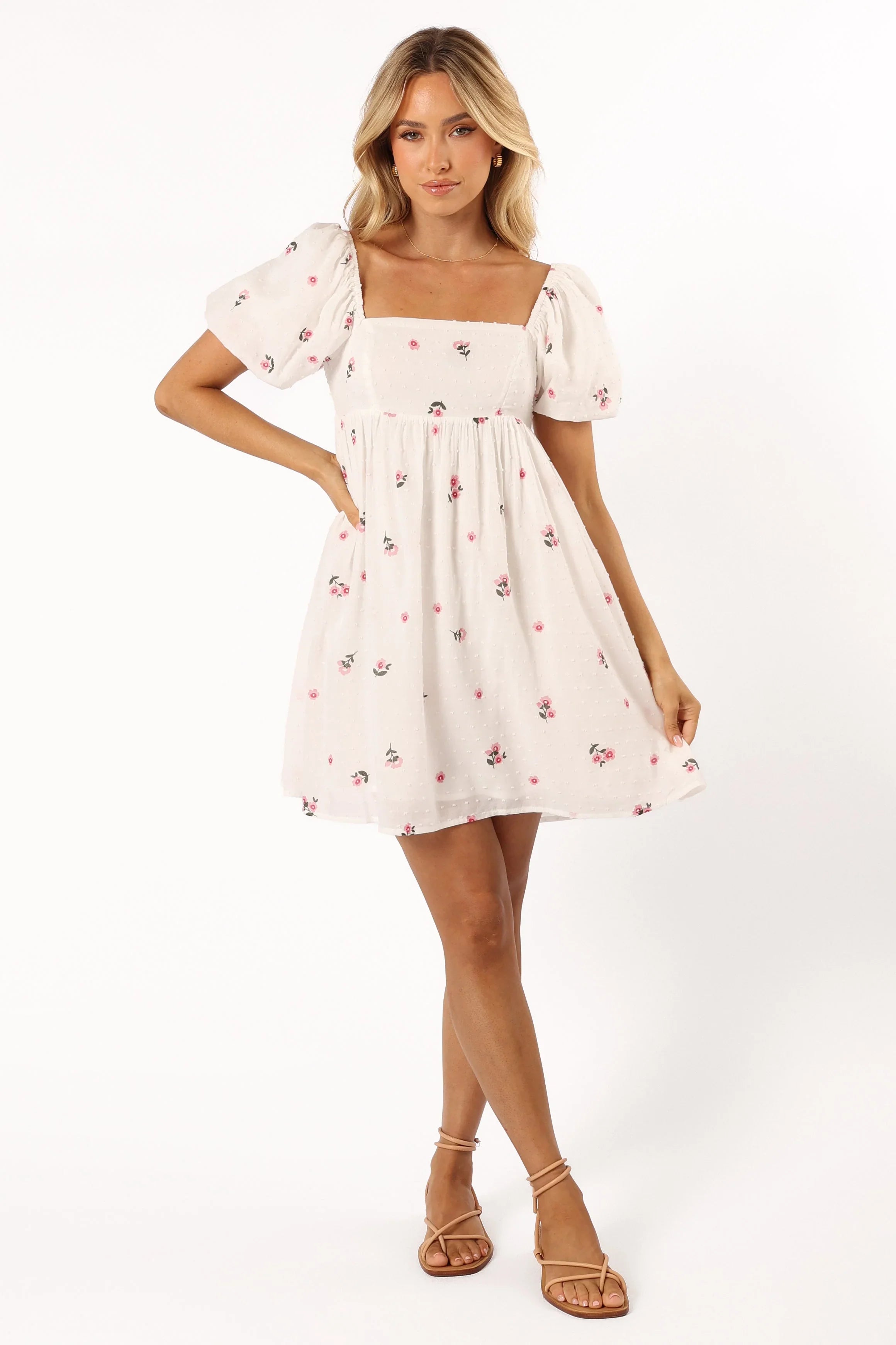 DETAILS This season's must-have mini dress is giving us all the summer feels! With a sophisticated square neckline, elasticised short sleeves and invisible back zip, this dress is designed to flatter your figure.