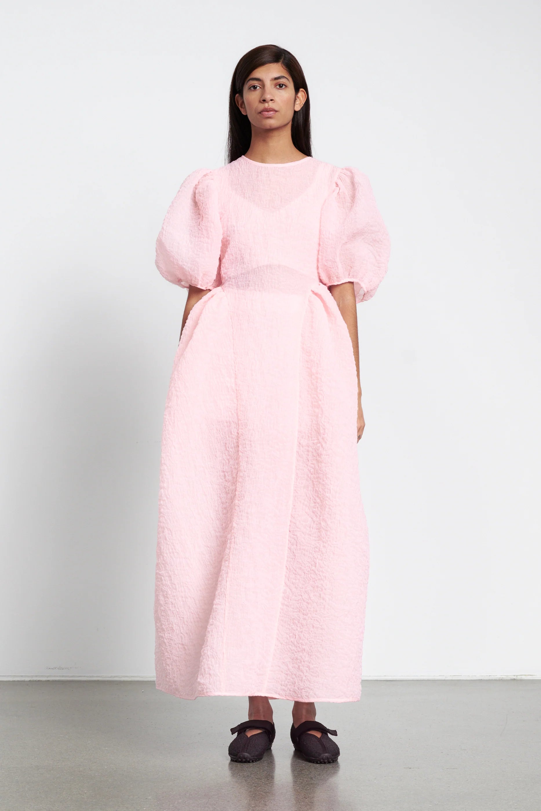 Crafted from a lightweight Wintermere MatelassÈ. the Ulani Dress embodies vibrant femininity through ease. The sculptural dress features a high bodice structure and shapely side panels in the skirt and billowy puff sleeves. Enclosed with a melody of ribbons and bows at the back. encompassing a poetic and feminine silhouette.