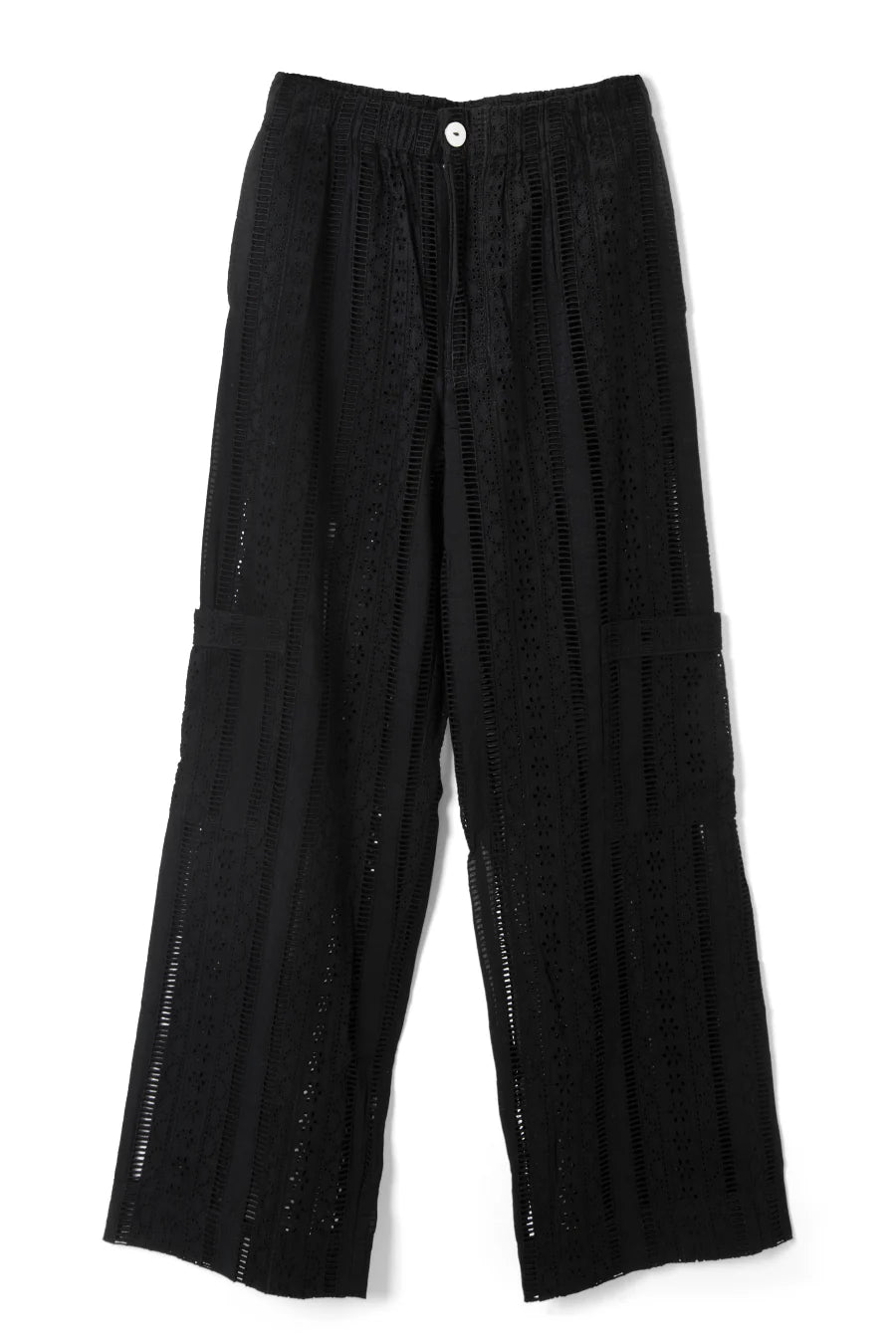 The Vacation trousers are our black pull on style trousers featuring an all over sheer broderie design. an elasticated waist and a front ties.