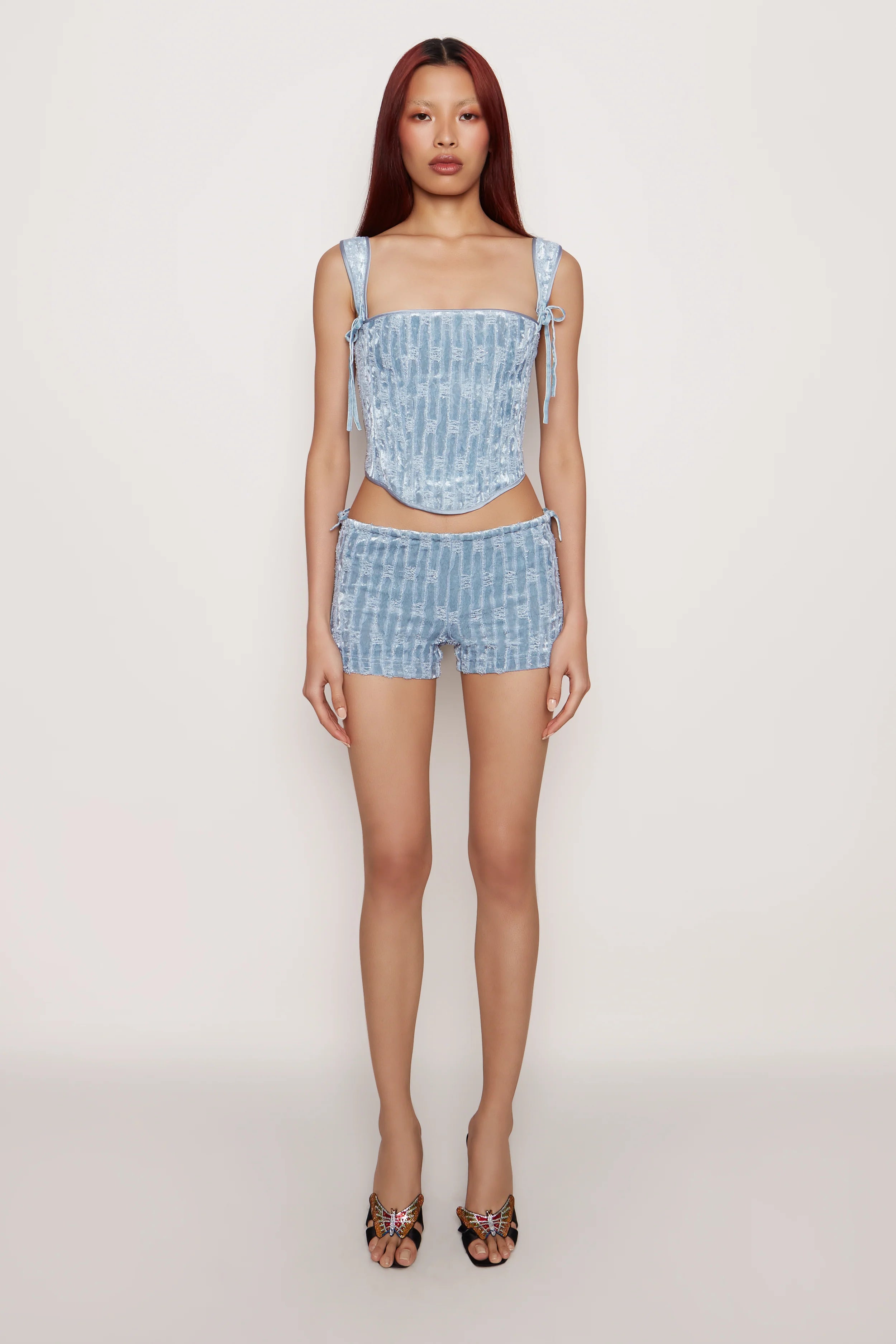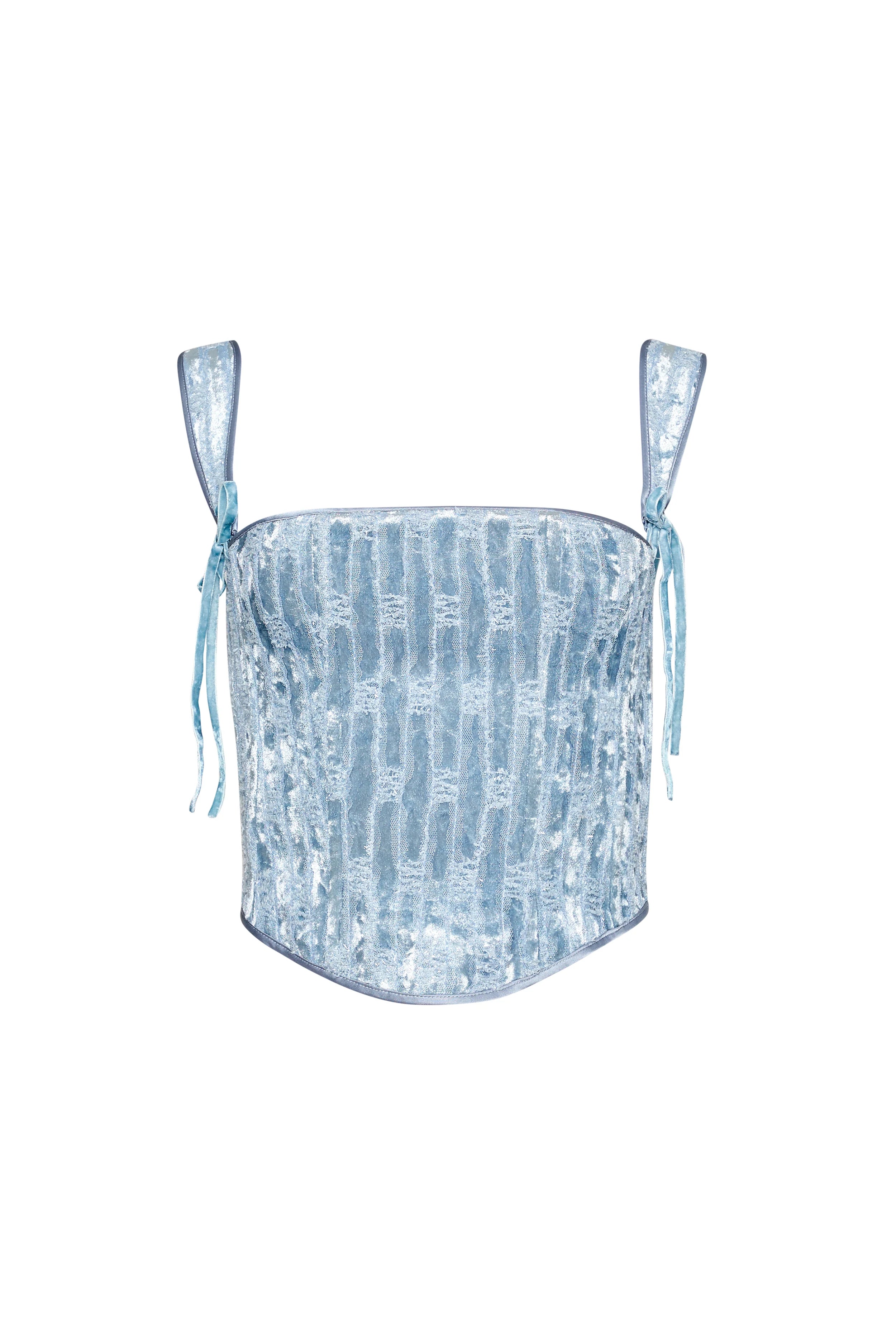 Have you ever seen a velvet corset? Introducing our Velvet Tie Corset. which lends rich texture to the beloved corset shape – stretch velvet pairs with mesh and metallic embellishing. all bound with lustrous satin. It's amazing as is. but even better with the matching Velvet Tie Shorts.