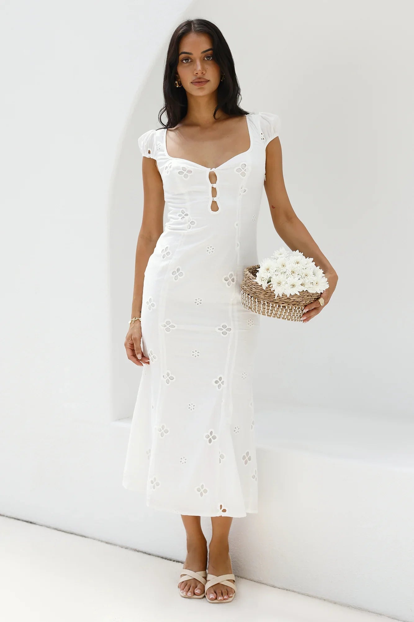 Romantic and effortlessly feminine, the Vintage Song Midi Dress White is a vision of sun-kissed charm. Crafted from lightweight embroidered fabric, this figure-skimming silhouette features a sweetheart neckline, delicate cap sleeves, and a buttoned front detail for a touch of vintage allure.