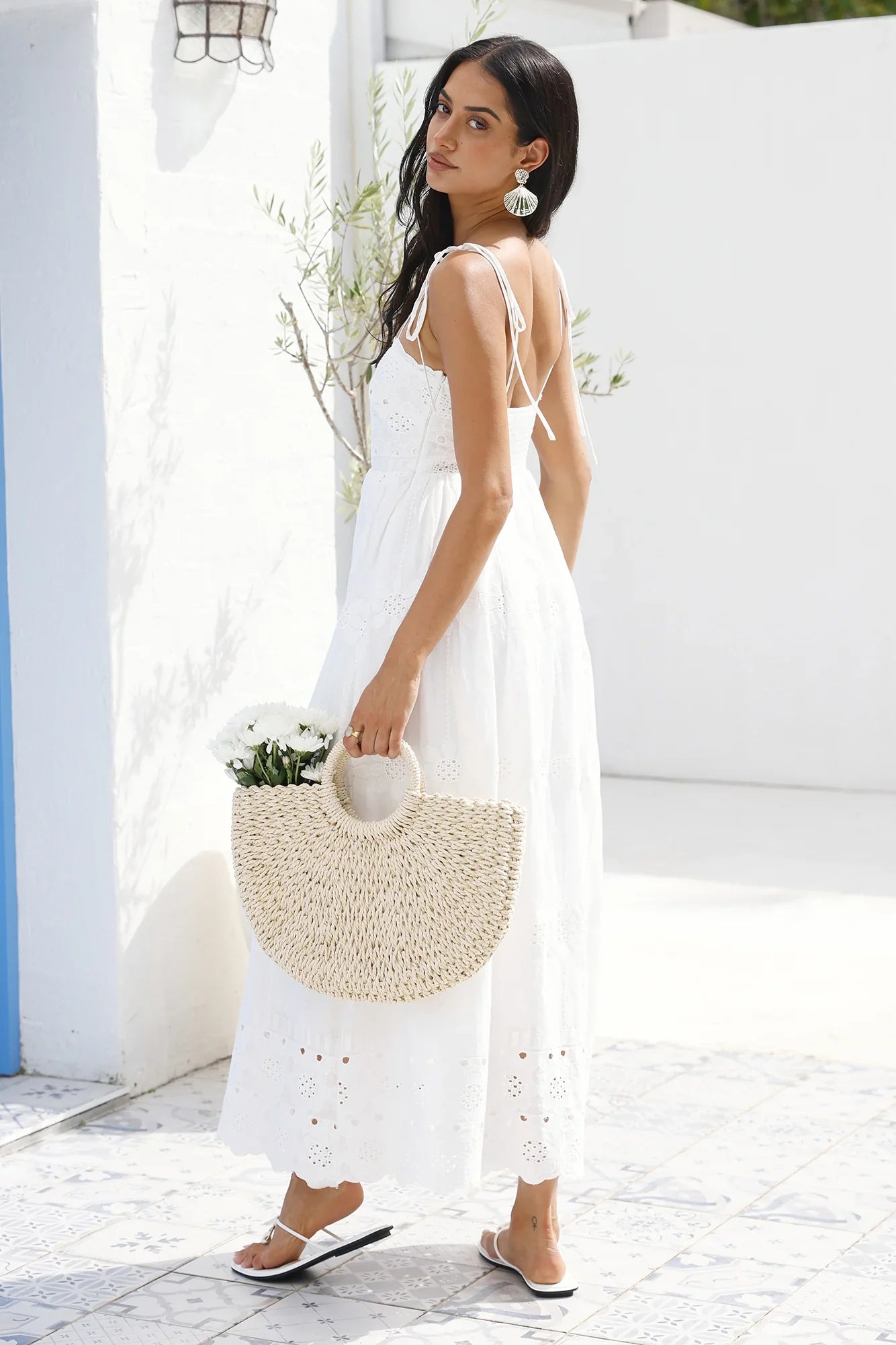 Sun-drenched days call for the effortless beauty of the Whispers of Spring Maxi Dress White. Crafted from airy white cotton with delicate broderie anglaise detailing, this dress embodies the romance of a coastal getaway. The scalloped neckline and adjustable tie straps add a touch of femininity, while the flowing silhouette moves gracefully with every step.
