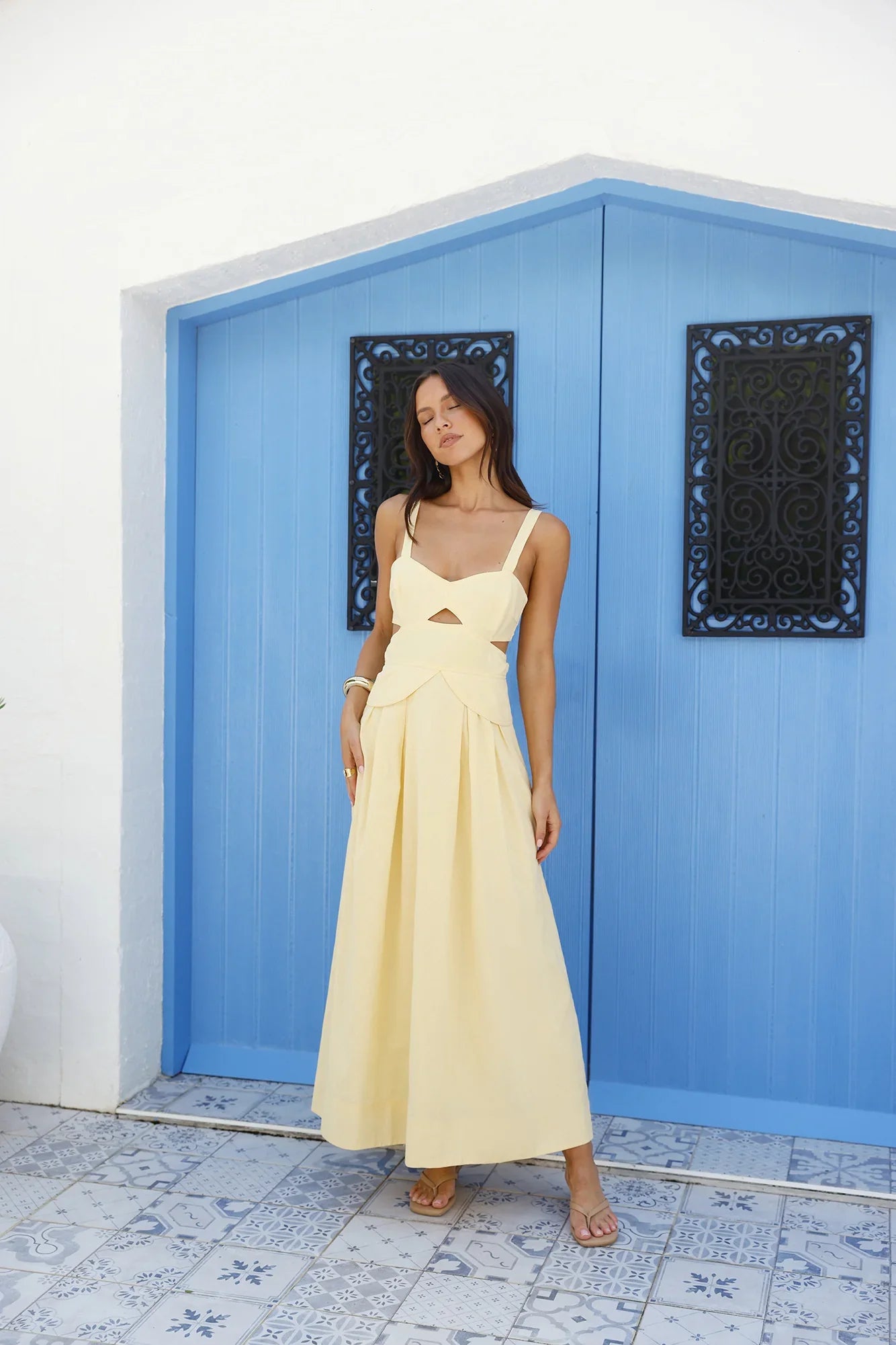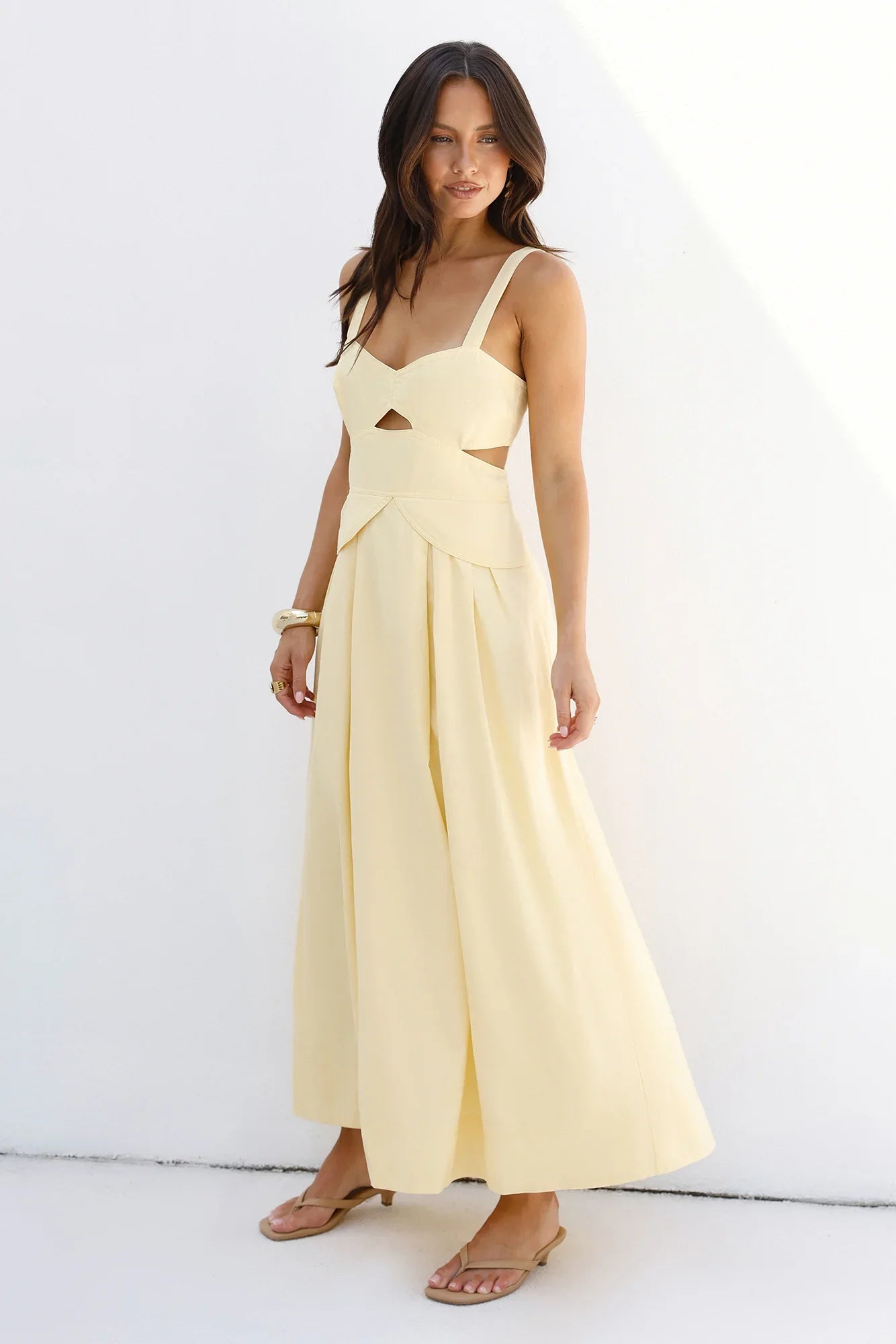 Bask in the glow of sun-drenched days with the Wild Dahlia Maxi Dress Yellow. Crafted from a breezy, lightweight fabric in a dreamy buttercream hue, this dress is made for warm-weather escapes. The fitted bodice features a structured bust with delicate cut-out detailing, flowing into a billowy A-line skirt that moves with effortless grace.