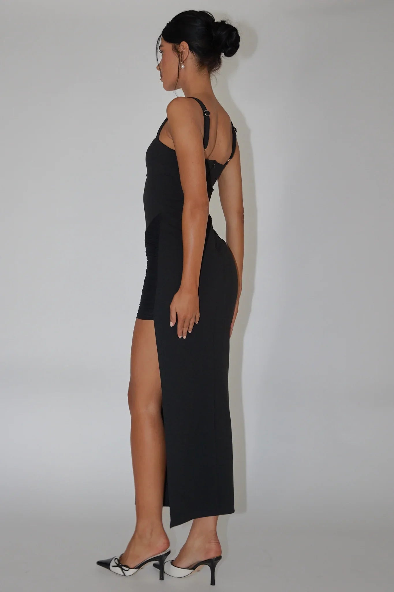 Make an entrance in our chic Zenya midi dress. Featuring ruching in the skirt and open, side split, it's perfect for a glam night out with your girls. Team it with black mules and a saddle bag for an on-trend look we are loving.
