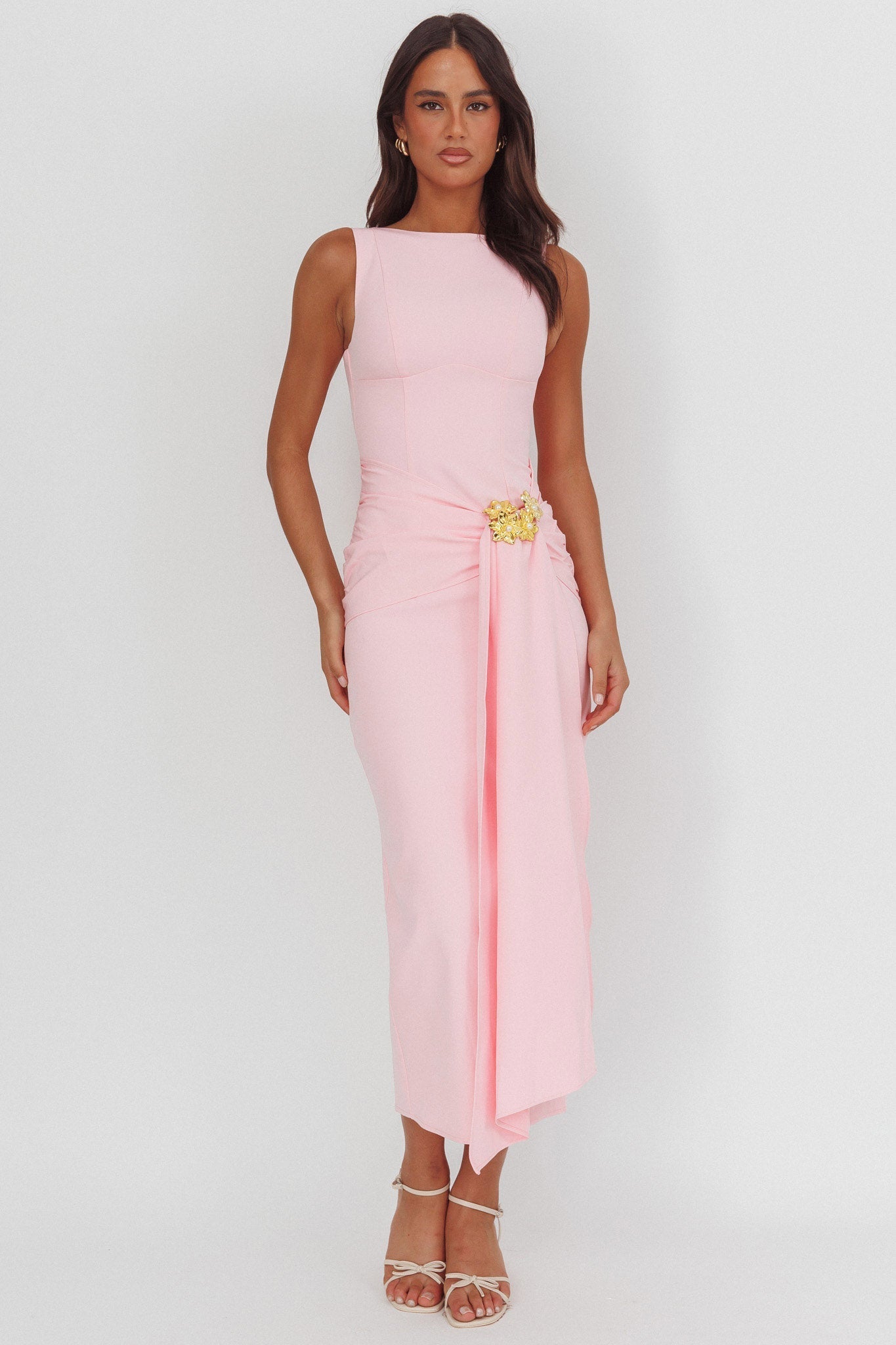 You will feel like a goddess in our stunning Zimora maxi dress. It features a draped sash in the waist and gorgeous gold brooch detail. It's perfect for a birthday celebration teamed with nude heels and a clutch for a jaw-dropping look.